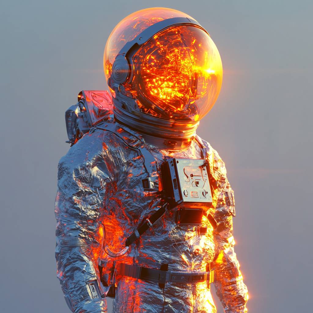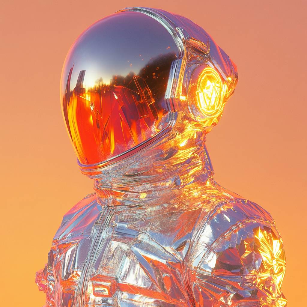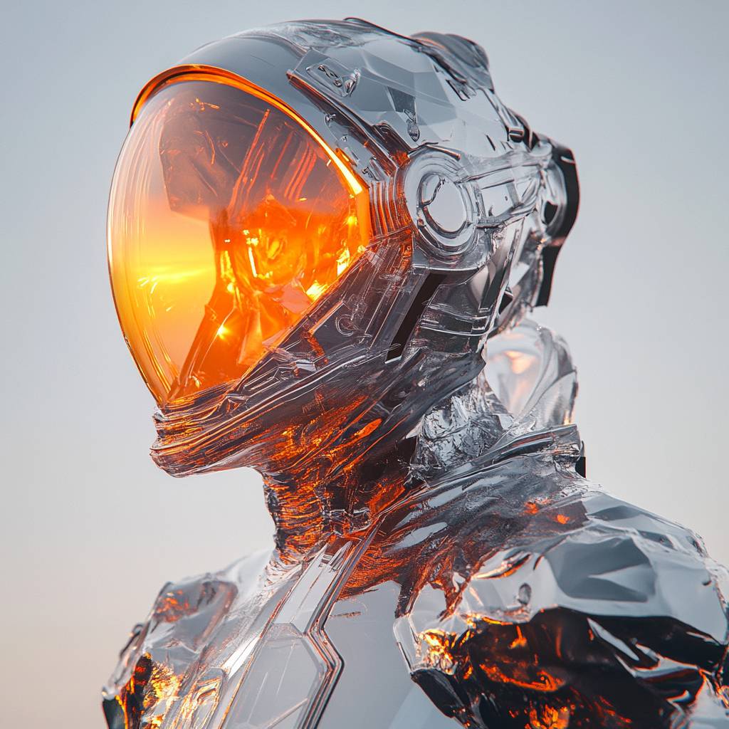 Ein futuristischer Astronaut, skulptural mit feinen Lin engravierungen, halbtransparentem Kristall strukturiert, schimmernd zwischen Dämmerungs silber und Neon orange Abstufungen, vor einem rauchigen Horizont. Studio-Höhepunkte verleihen Tiefe und Strahlkraft.