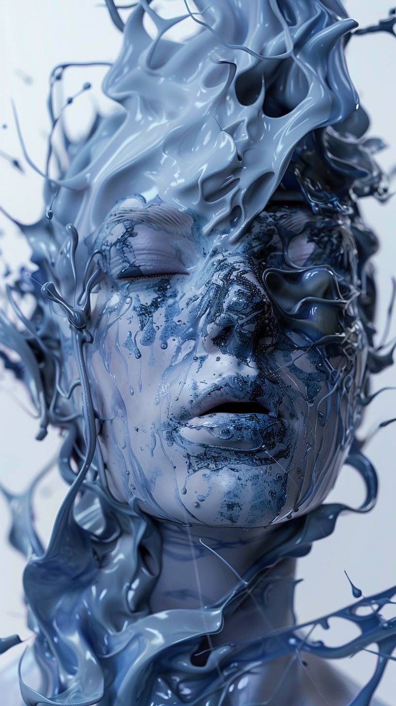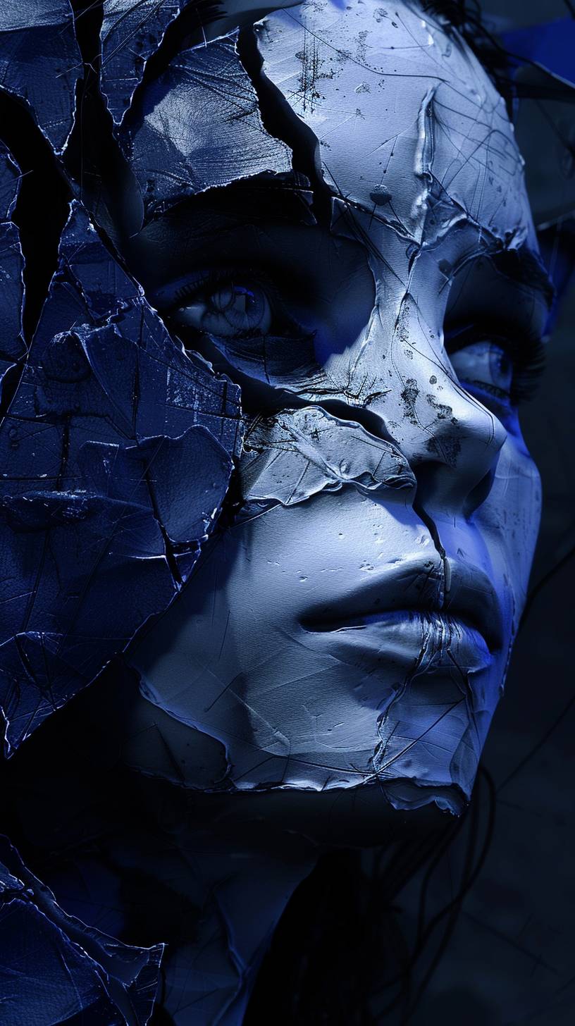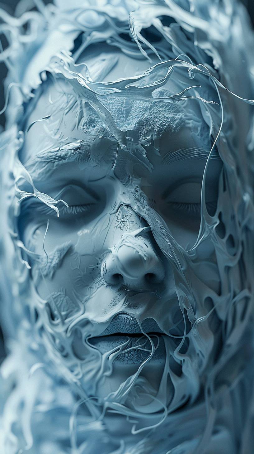 A woman embedded in swirling blue shadows, sculpted as a striking figurine through the lens of zbrush, her features appearing eerily animated. She exudes the energy of supernatural creatures, her expression a complex nest of emotions. Veering toward zombiecore aesthetics, her face is masked with stark white paint, chiseled features smeared in contrasting dark hues. --ar 9:16 --v 6.0