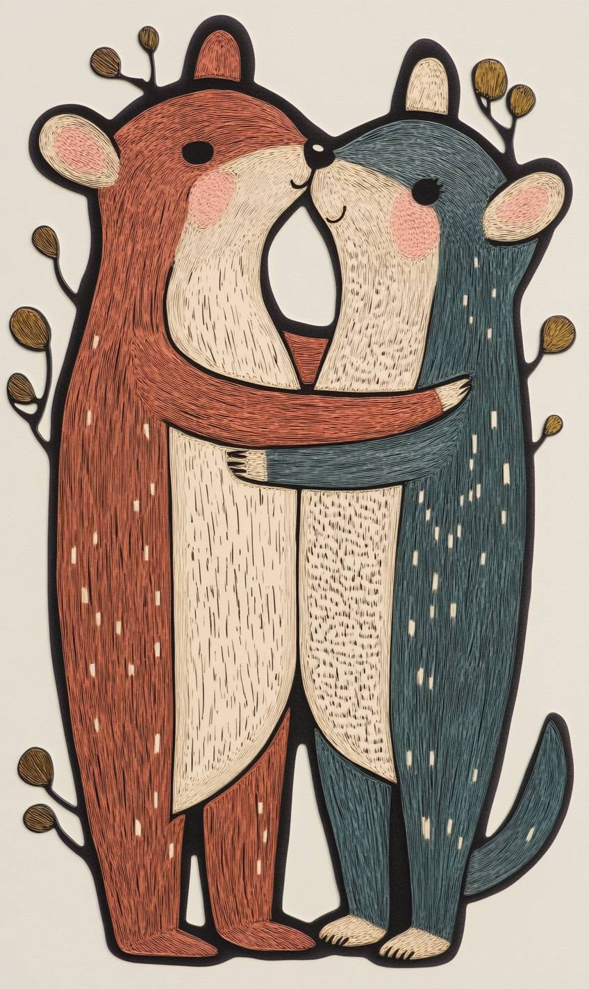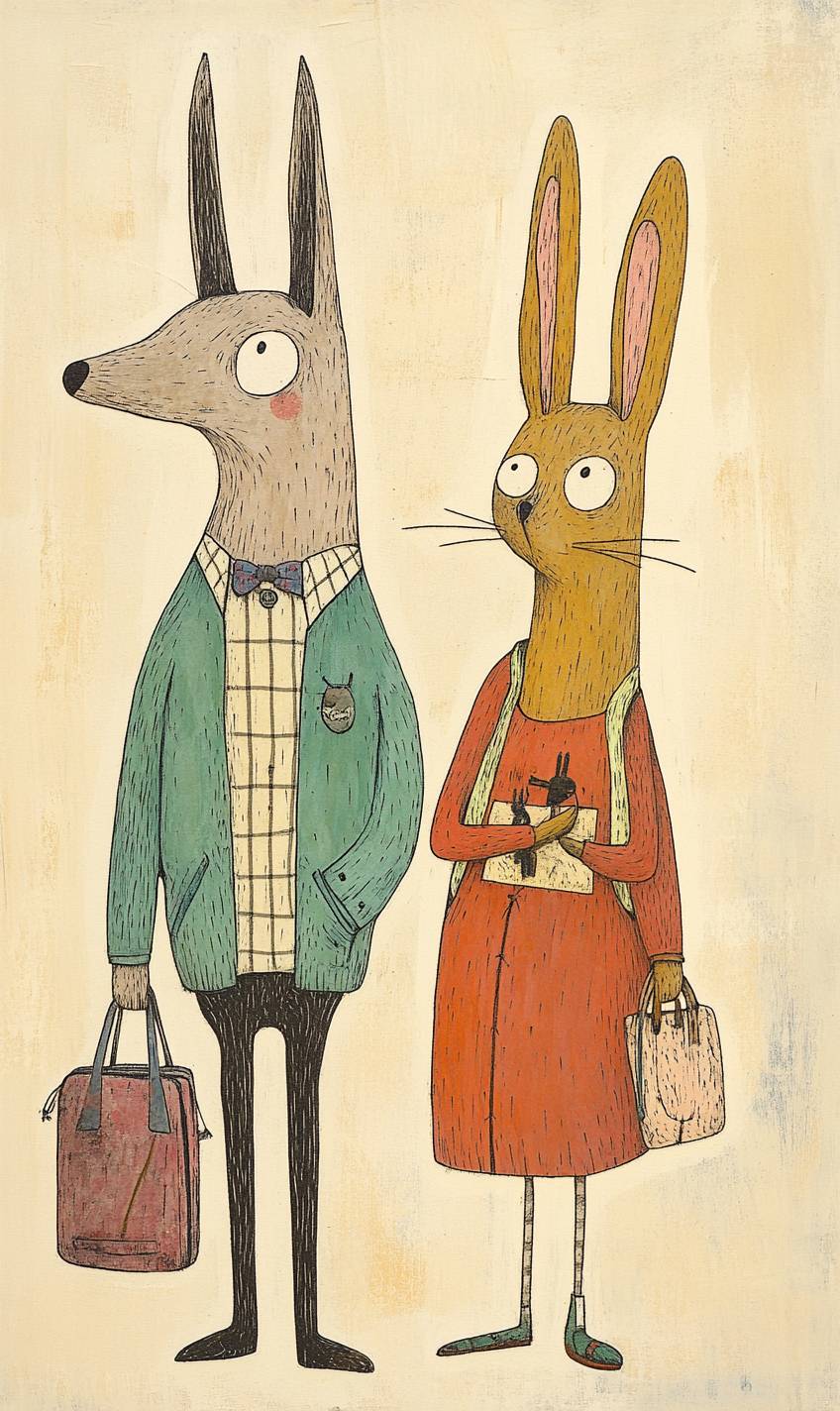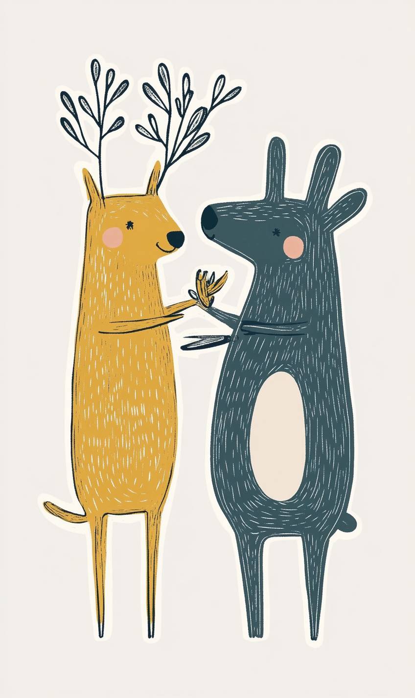 Marc Johns's a whimsical cut sticker depicting two animals engaging in human activities, with a muted color palette and simple, clean lines, solid background --v 6.1 --ar 3:5