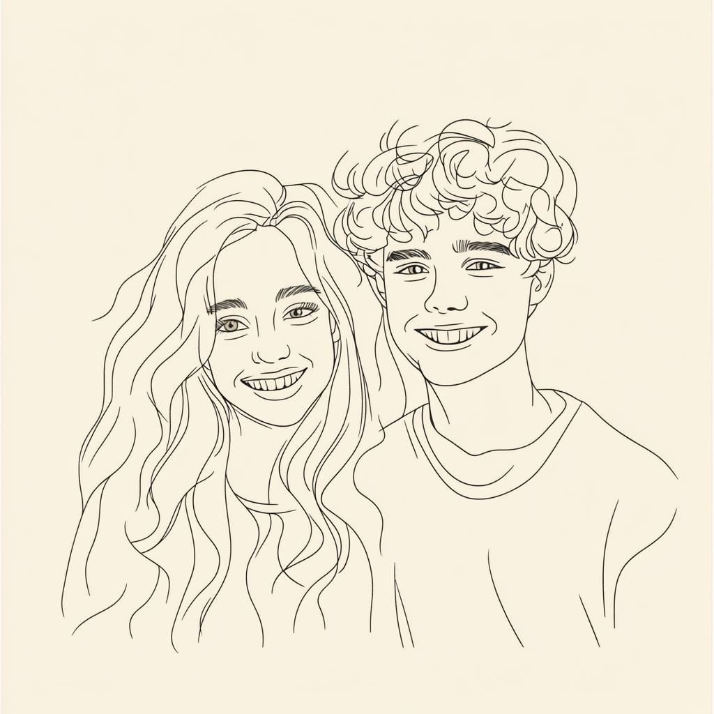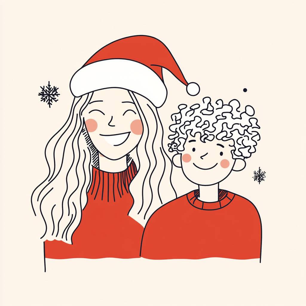 minimal one line christmas ilustration of a blond long hair girl smiling with a curly short and white hair boy --v 6.1