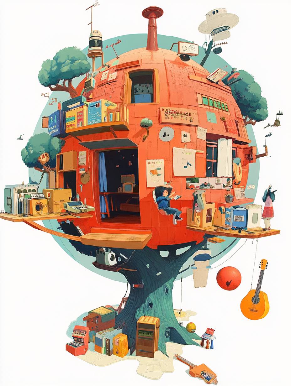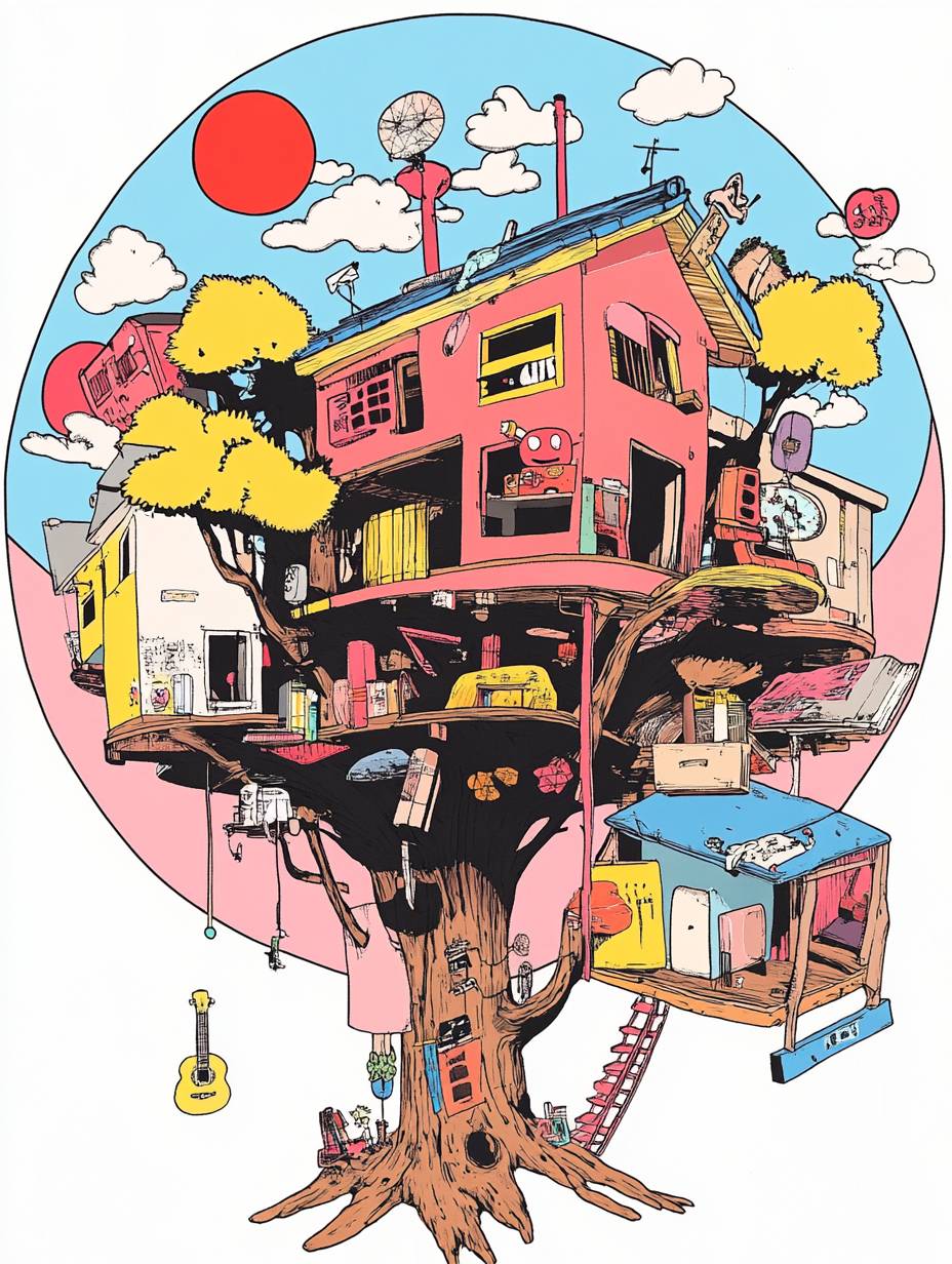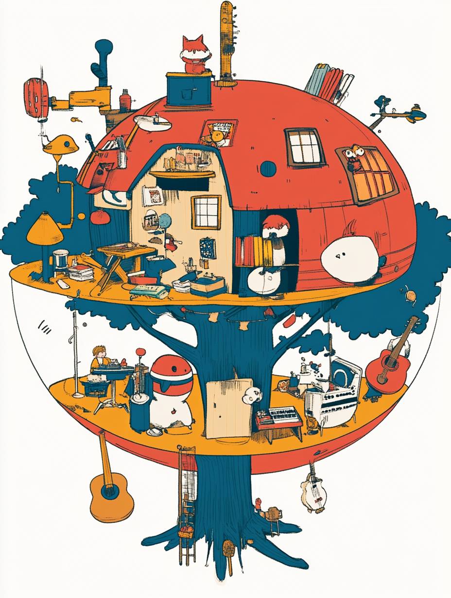 A cute illustration of a tree house inside an anime-style sphere, featuring multiple angles and different perspectives. The design includes various objects such as musical instruments, toys, books, colorful Japanese lettering, vibrant details, flat colors, and simple shapes. It is presented on a white background with no shadows, in the style of Moebius. --ar 3:4 --style raw --profile bwov8qe --stylize 50 --v 6.1