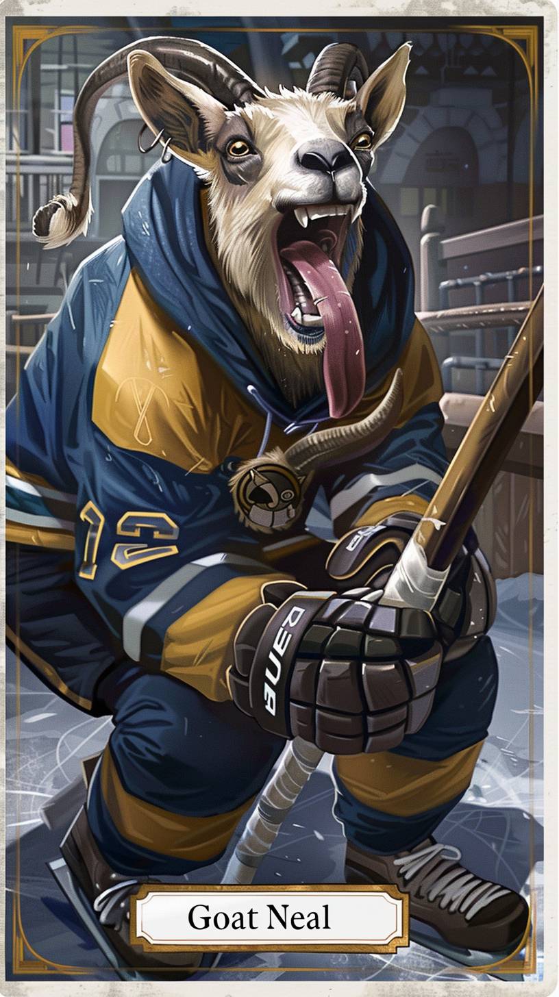 Eine Hockey-Spielerkarte eines Ziegenbocks mit herausgestreckter Zunge in Hockeyausrüstung, die einen Hockeyschläger hält. Am unteren Rand steht 'Goat Neal'.