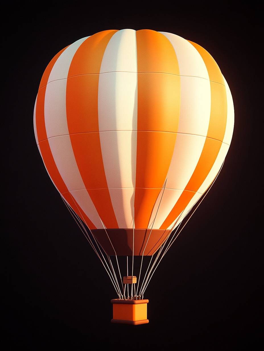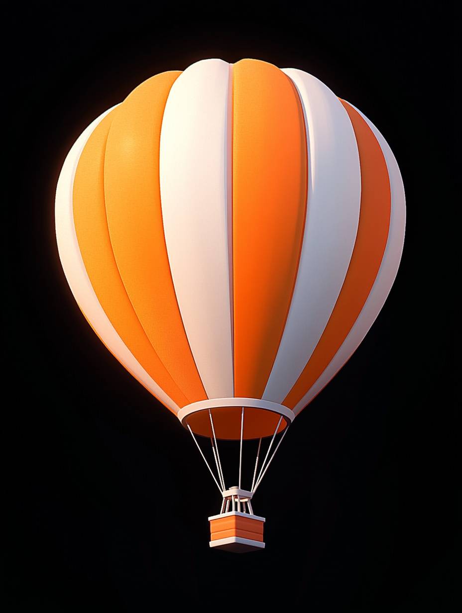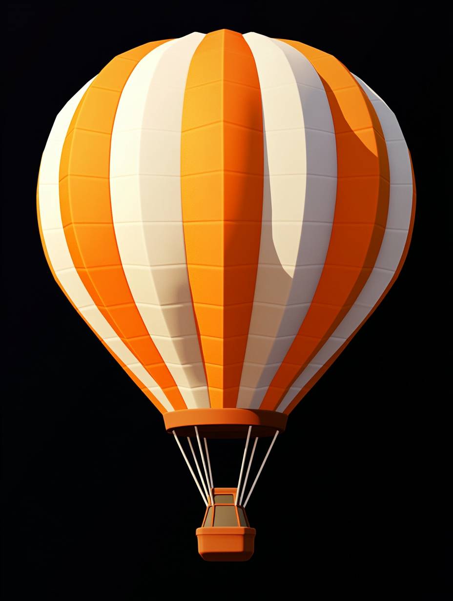 Hot air balloon icon, in orange and white colors, in a cartoon style, with an isometric view on a black background. Game art design, with low-poly rendering, soft shadows, no gradient shading, high resolution, high contrast, bright colors, and flat color. 3D render. --ar 3:4 --v 6.1