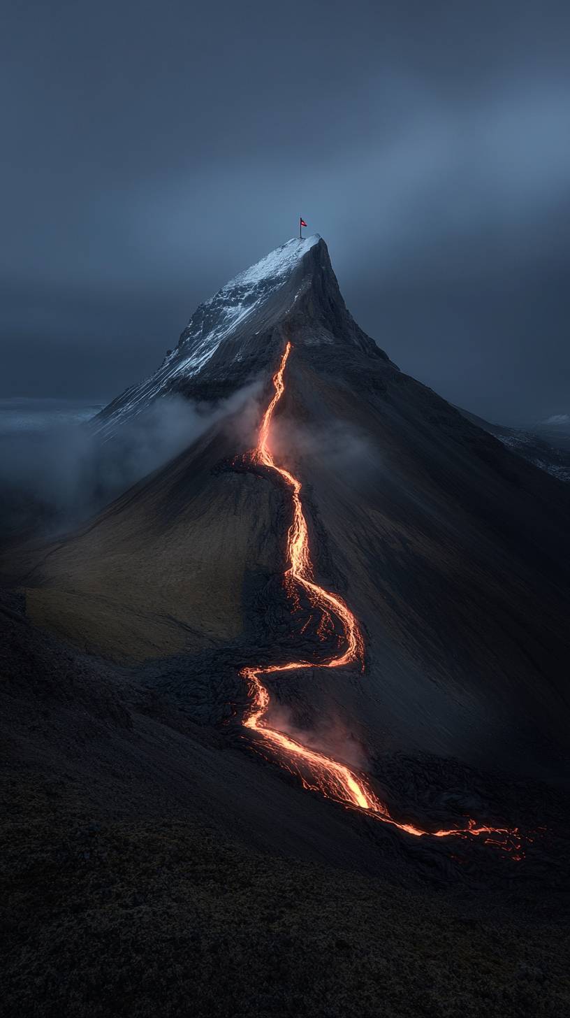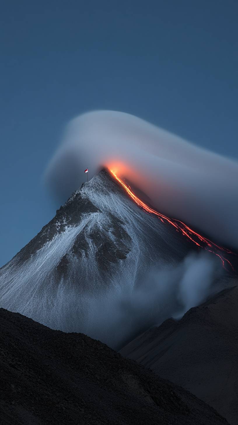 A night photograph of the top of an alpine mountain with glowing red lava flowing down its side. The flag on top is visible in the distance, creating a cinematic, moody atmosphere against the dark blue sky and snow-covered mountain. The composition follows the rule of thirds, resulting in a hyper-realistic image. This photograph was taken in the style of Daniel Kordan, featuring an anamorphic lens flare effect at sunset. --ar 9:16 --style raw --profile g1xjlku --stylize 250 --v 6.1