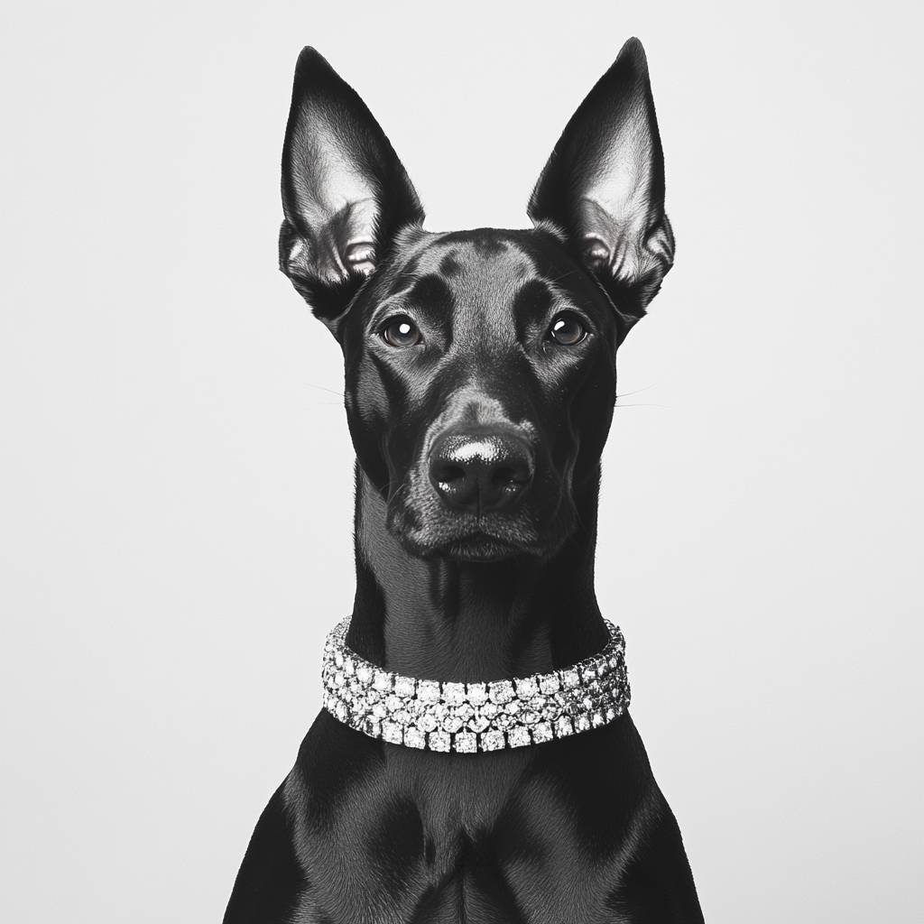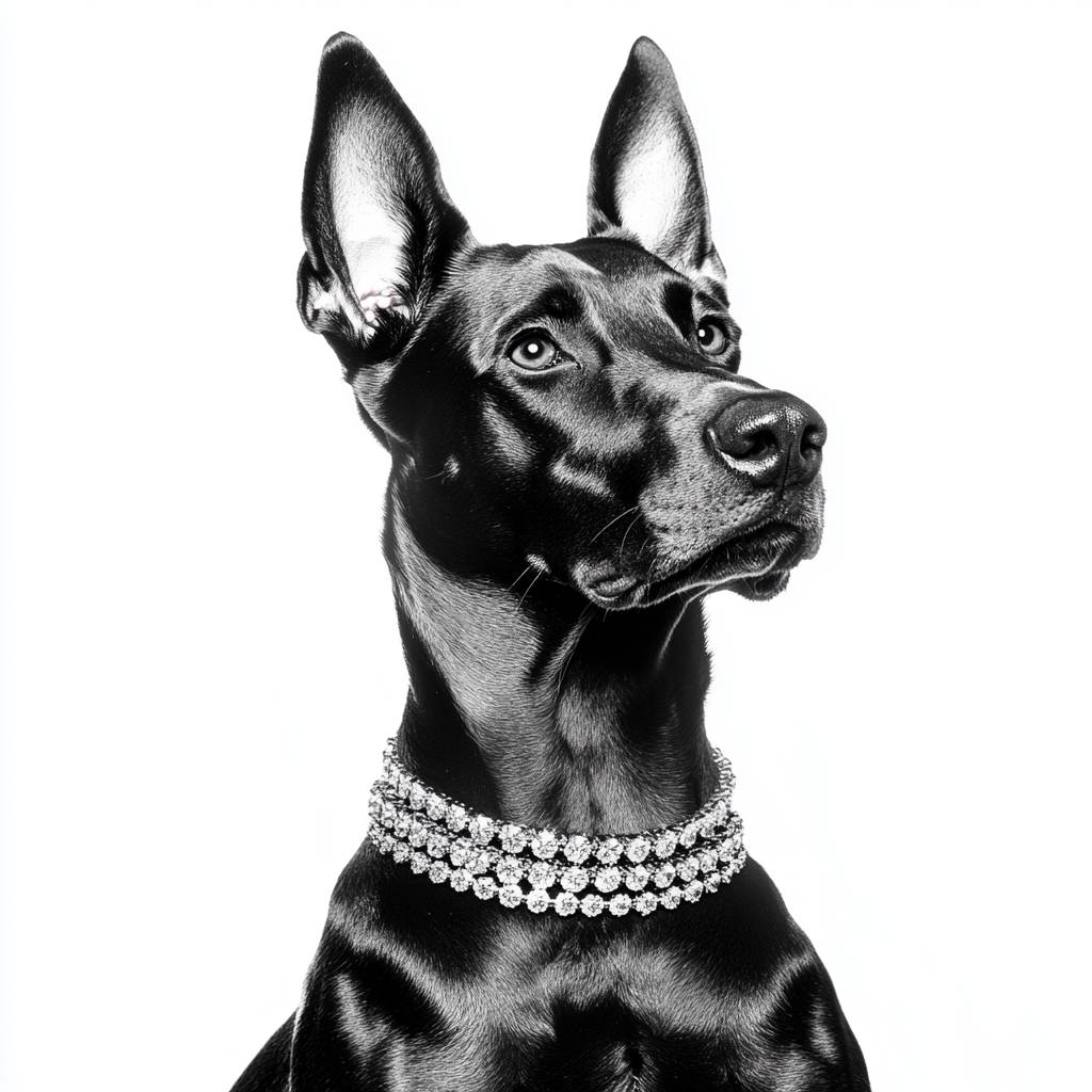 luxury doberman with diamond necklace, png, white background, real photo, shiny pointy ears, full body, editorial shot, black and white --style raw --v 6.1