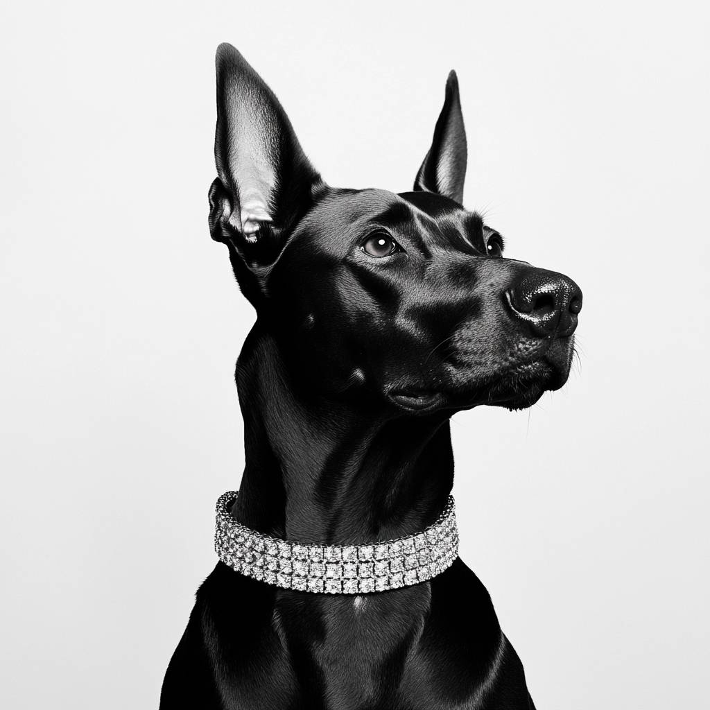 Ein luxuriöser Dobermann mit einer Diamant-Halskette.