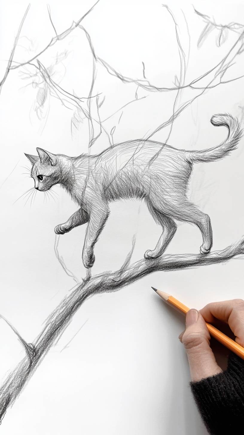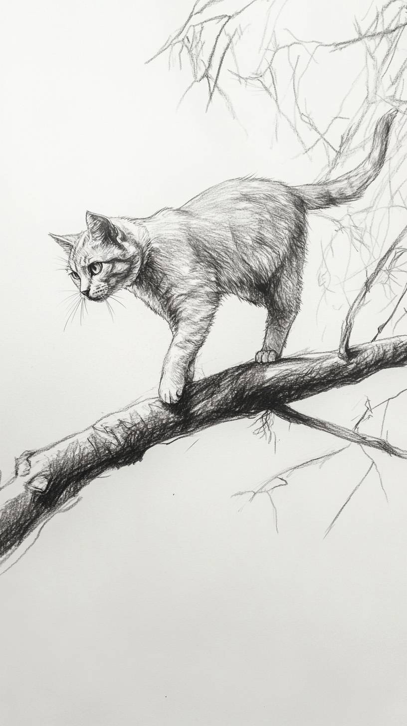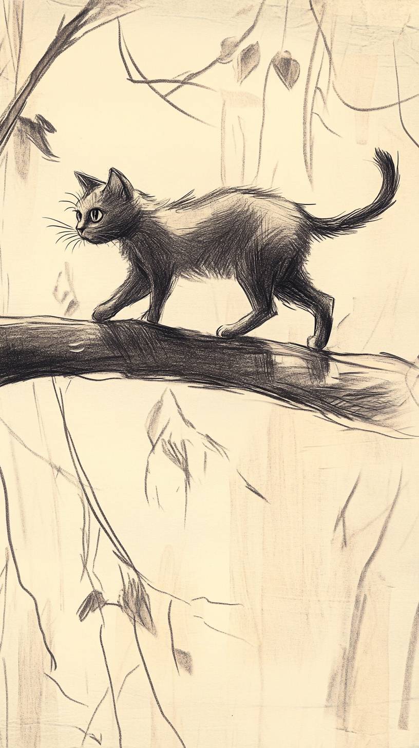 A hand drawn rough pencil sketch figure of a cat walking on a real tree branch, the cat figure is 2D animation and the environment is realistic, mixed reality --ar 9:16 --v 6.1