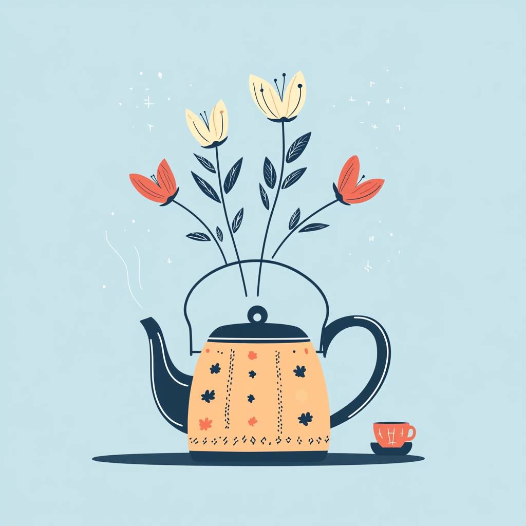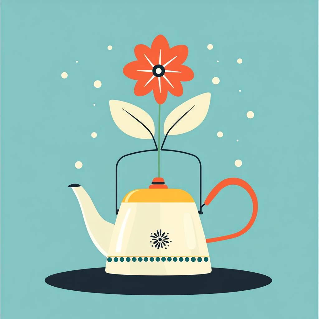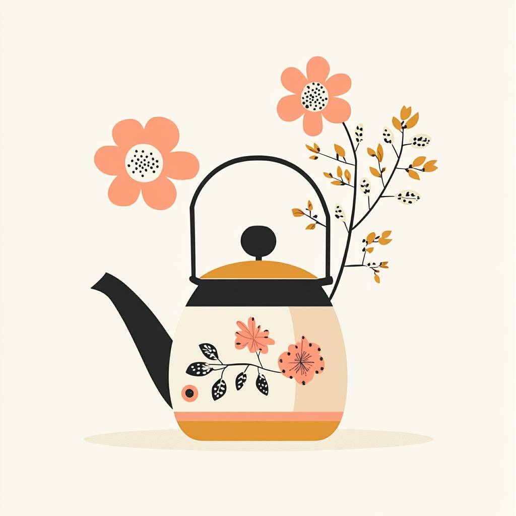 A sophisticated modern vector illustration of a flower blossoms to be used as a decorative motif on a hygge tea kettle. whimsical, flat, animated, cozy modern danish hygge style --no shading. --v 6.1 --style raw