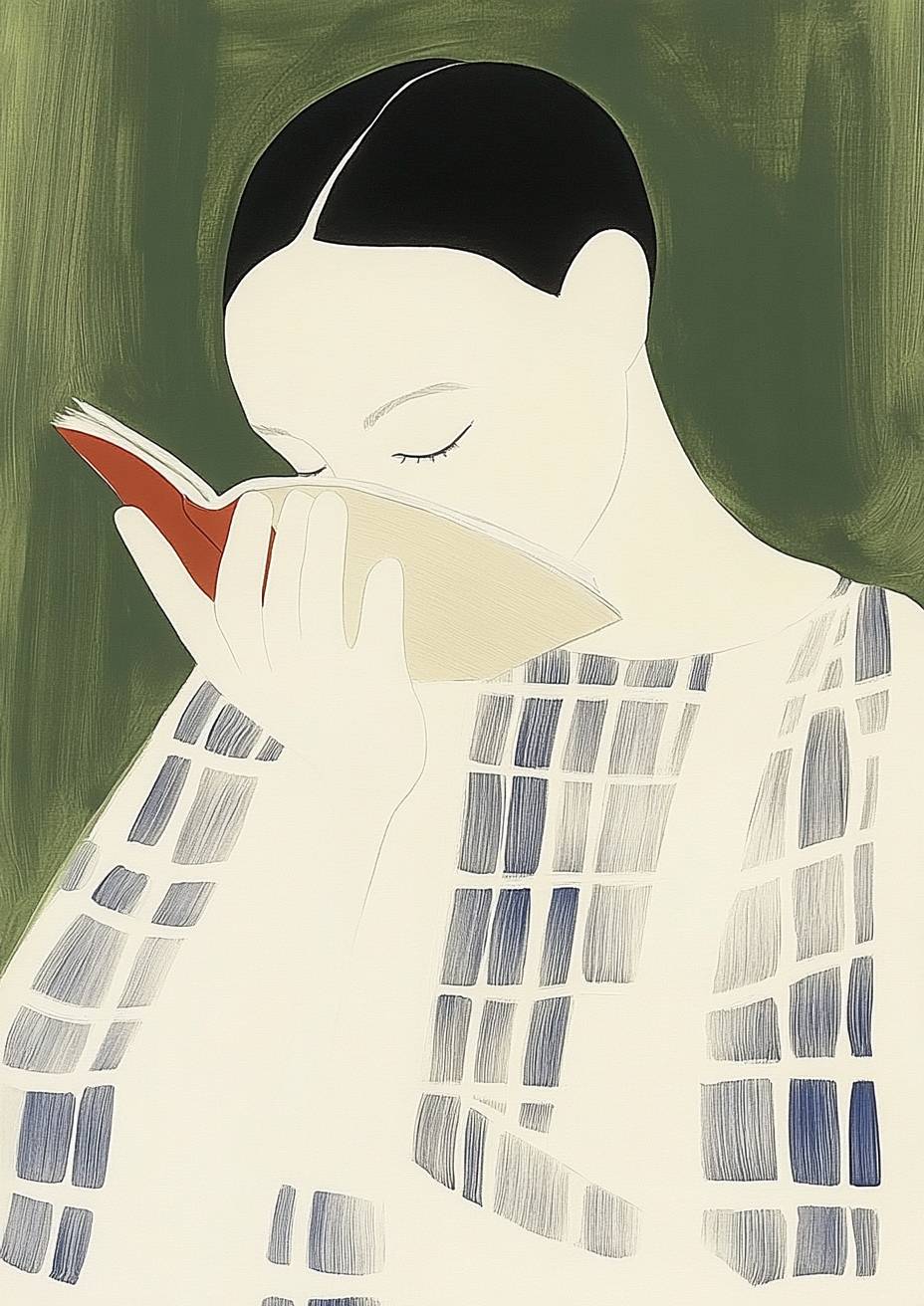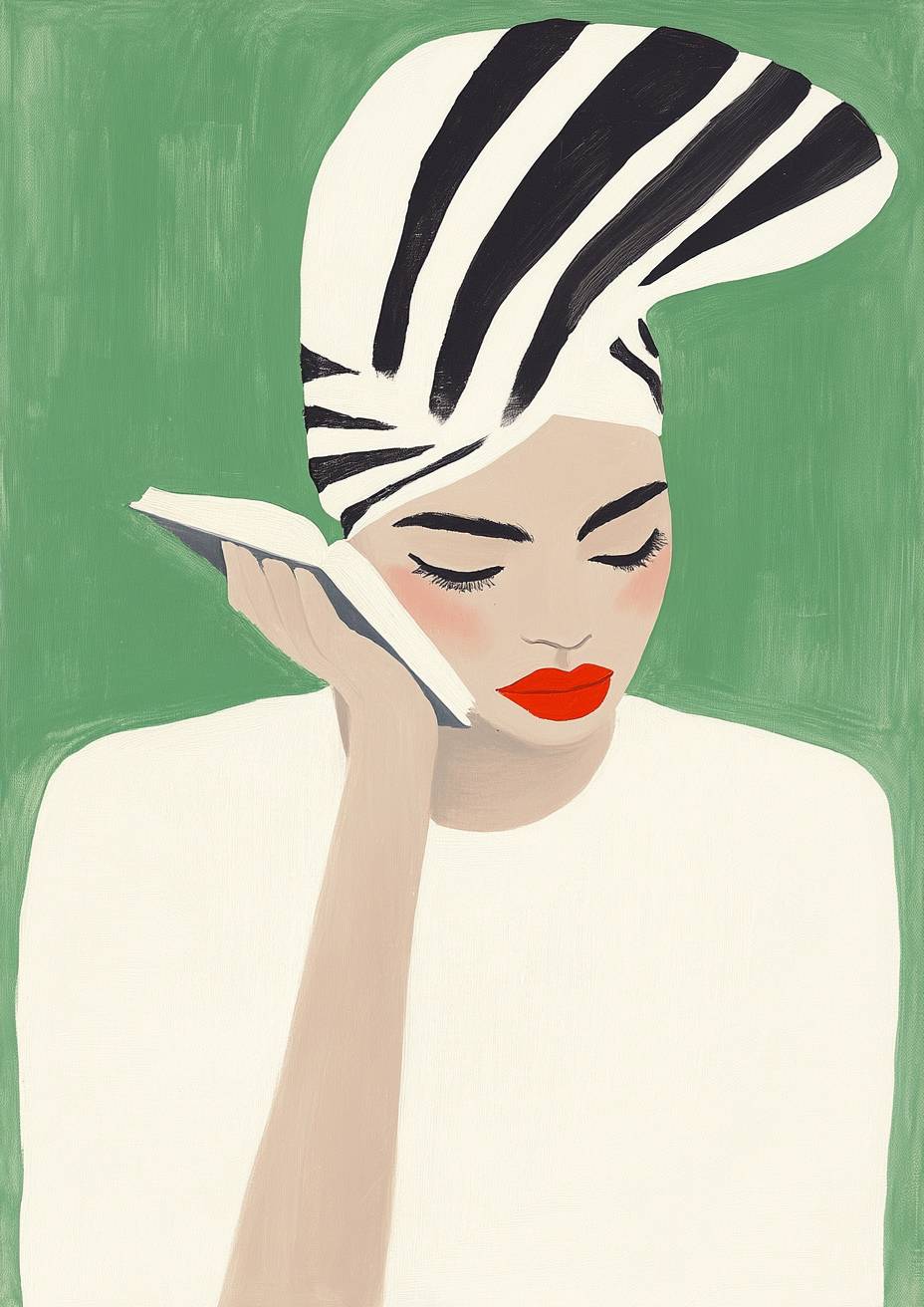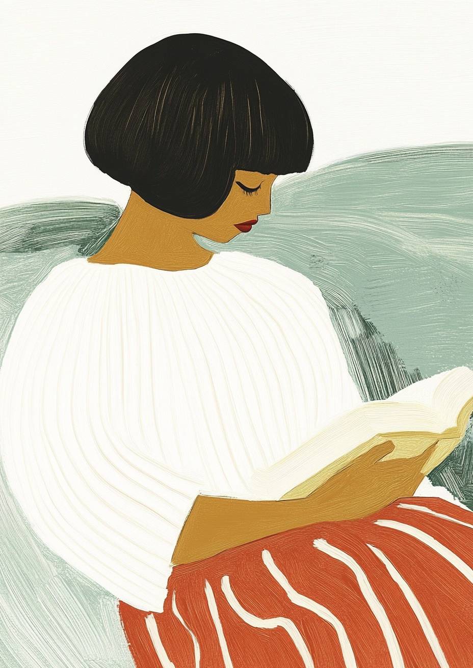Ein Ölgemälde einer abstrakten Frau, die ein Buch liest, vor einem smaragdgrünen Hintergrund.
