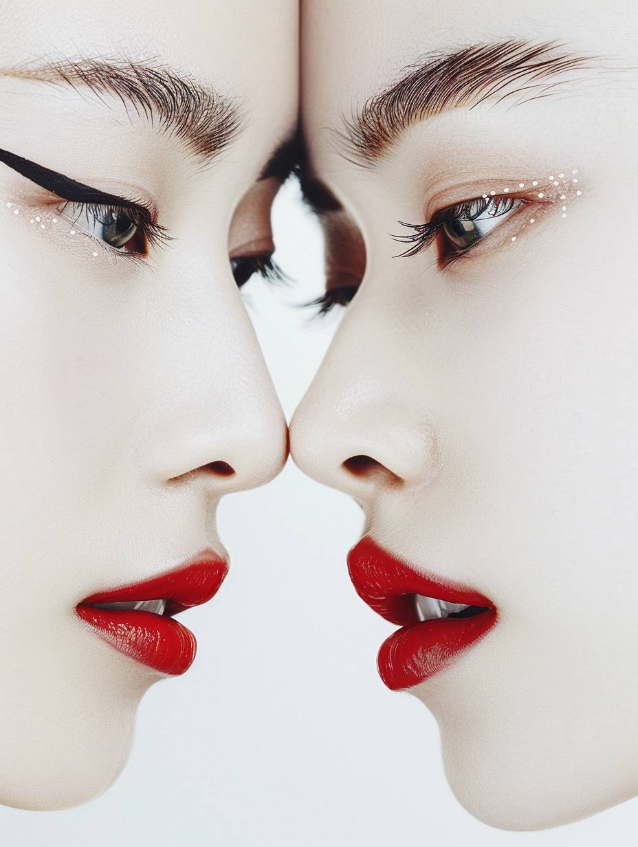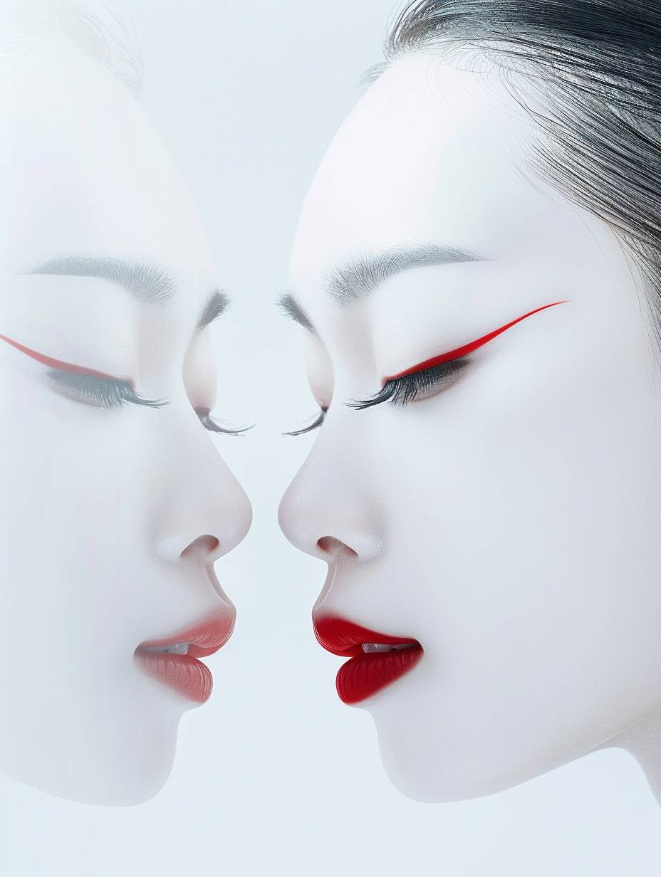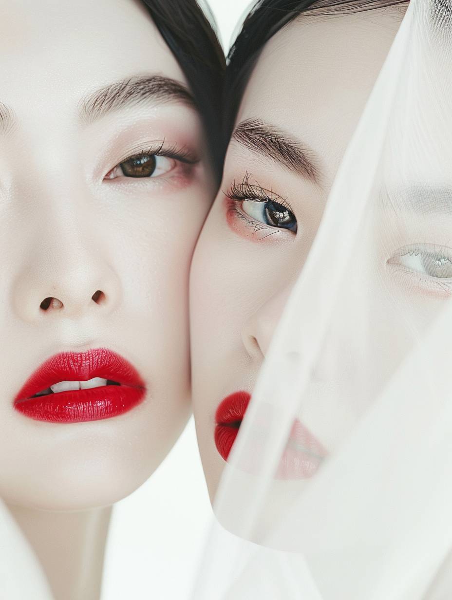 Elegante Zwillingsfrauen aus Shanghai mit schönen Augen, langen Wimpern und roten Lippen vor einem rein weißen Hintergrund, der Minimalismus und ethereal Zen zeigt.