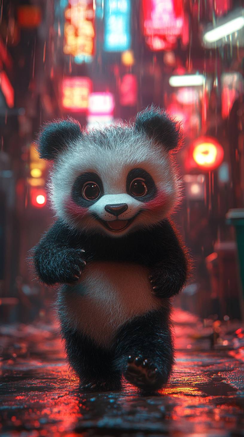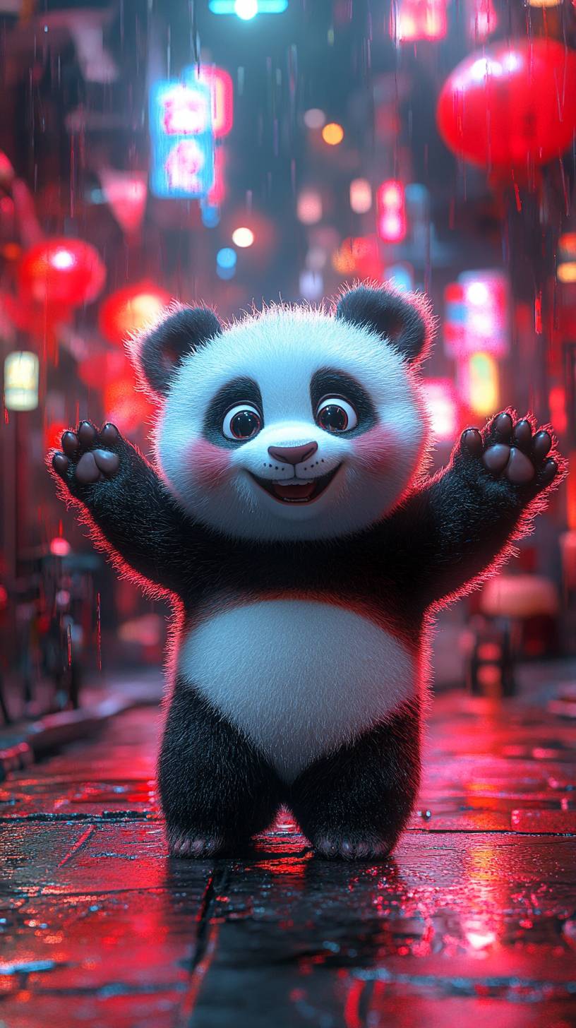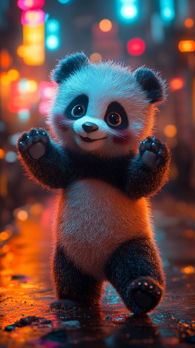 Ein niedlicher, pummeliger Panda tanzt in einer Stadtlandschaft mit Neonlichtern.