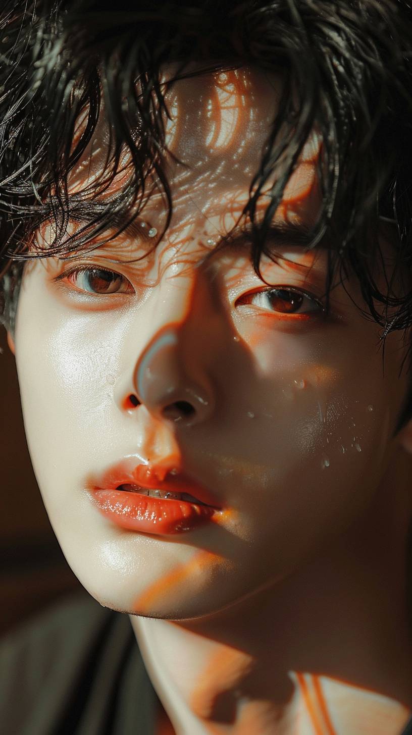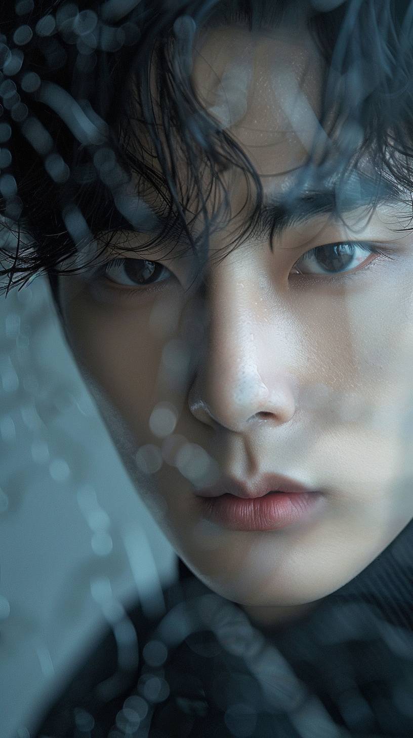 Realistic photo a Close-Up Shot, korean actor Cha Eunwoo, 28 years old, Homme Fatale, male model, looking in the direction of the camera, in the style of gongbi, dreamy and romantic, exaggerated facial features, light black and light amber, aurorapunk --ar 9:16 --style raw --stylize 250 --v 6.0