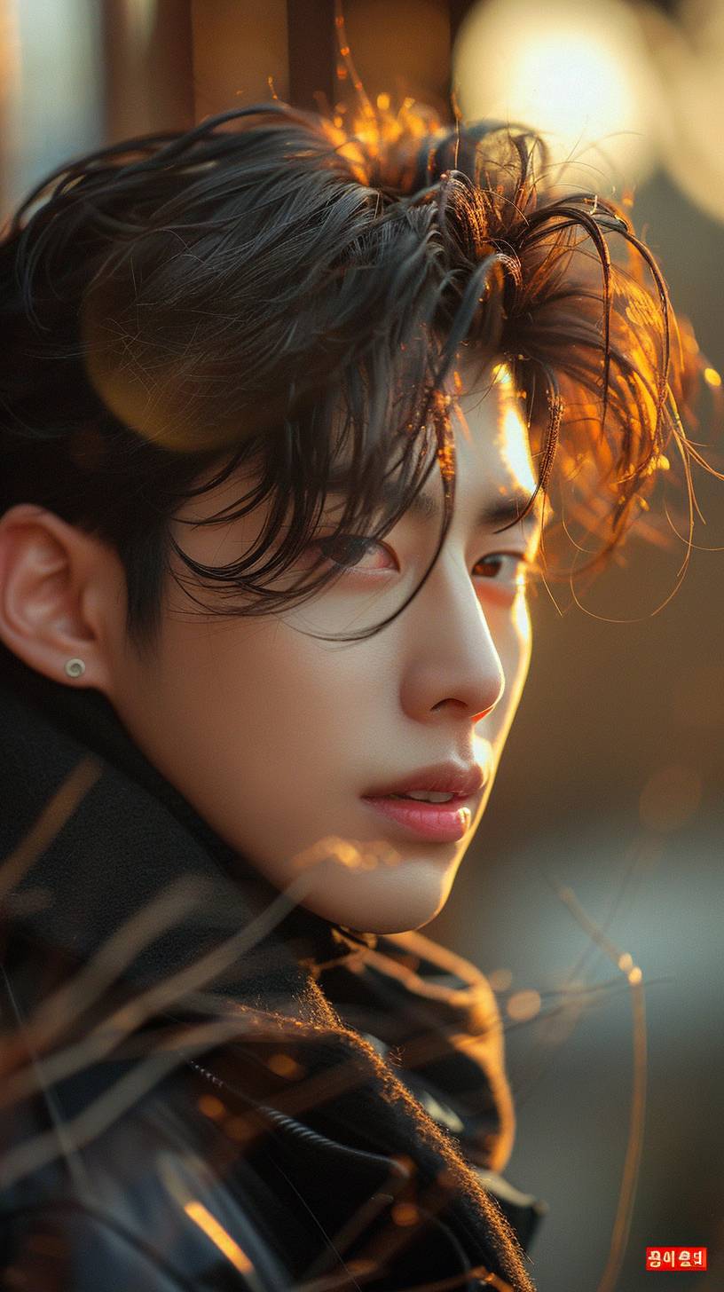Realistisches Foto im Nahaufnahme, koreanischer Schauspieler Cha Eunwoo, 28 Jahre alt, homme fatale, männliches Model, schaut in Richtung der Kamera, im Gongbi-Stil, traumhaft und romantisch, übertriebene Gesichtszüge, hellschwarz und hellbernstein, Aurorapunk.