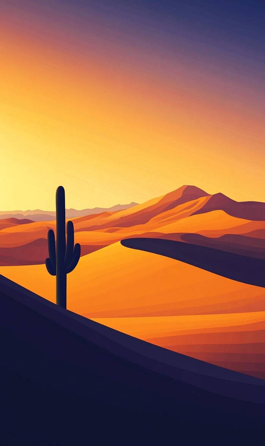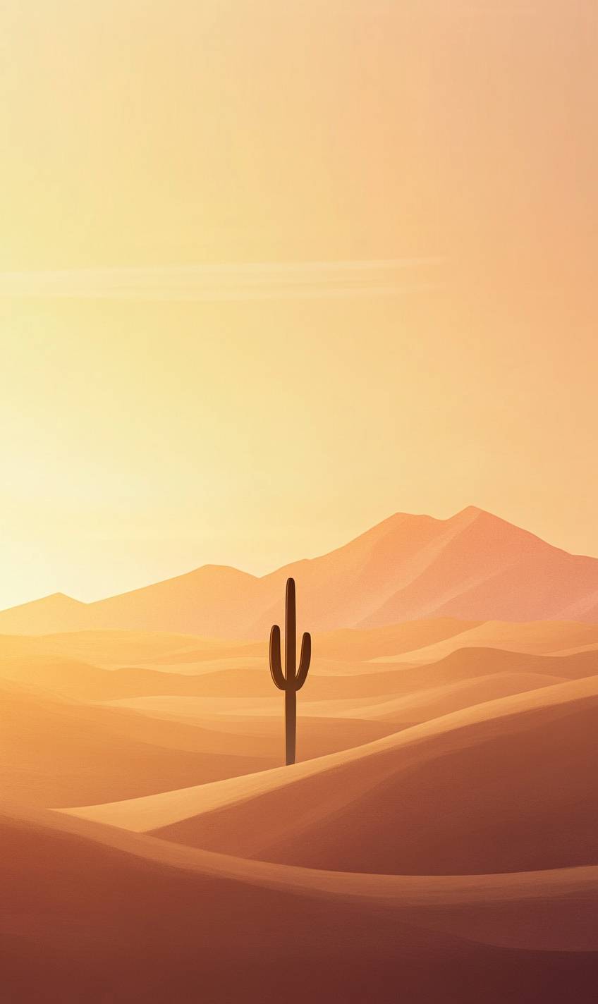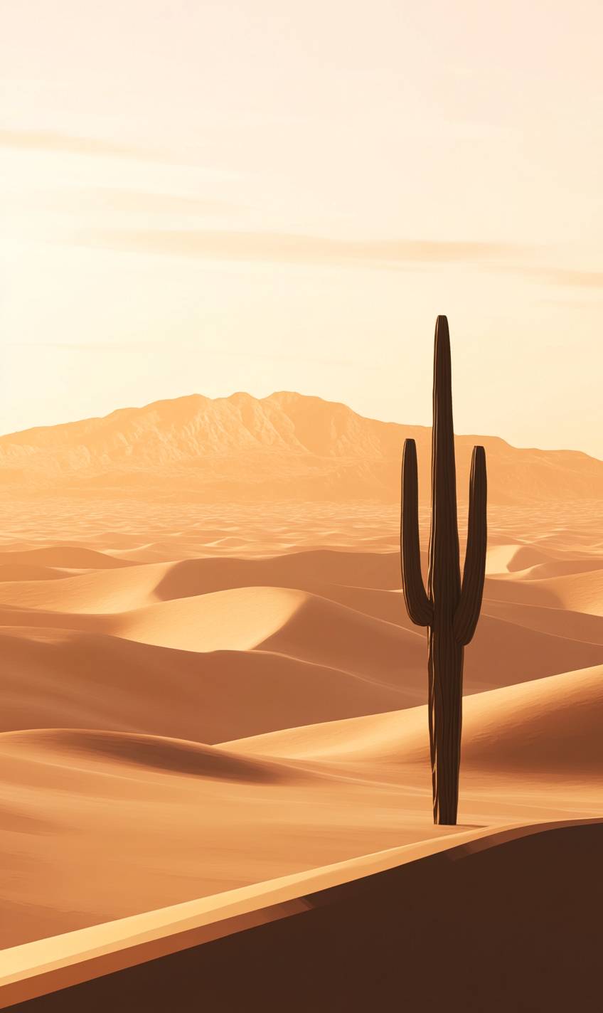 Desert landscape at sunset, towering sand dunes, soft golden hues, warm gradient sky, solitary cactus, long shadows, calm and serene, expansive horizon, minimalist style --v 6.1 --ar 3:5