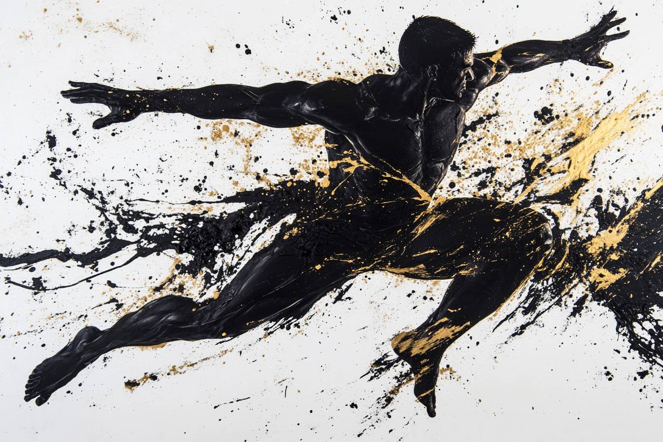 Eine flüssige Tintenplatschgeschwindigkeit eines Kampfkünstlers, der den Sportler mitten in der Bewegung zwischen dynamischen Spritzern fließender Farben einfängt. Mit Spritzern aus Schwarz und Gold, um ausdrucksstarke Silhouetten von Körpern in Bewegung zu formen, die das Momentum und die Fluidität des Wettbewerbs hervorrufen.