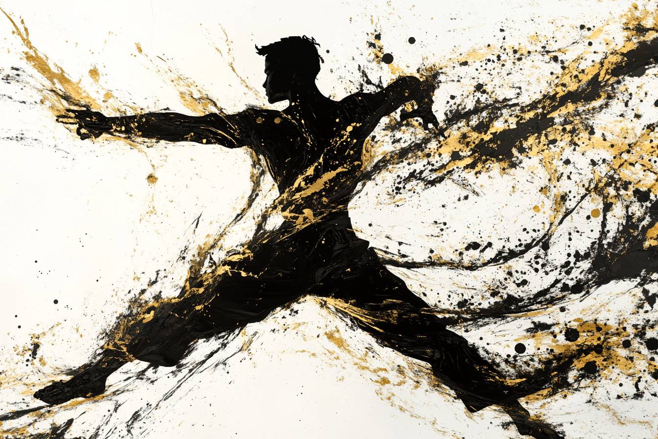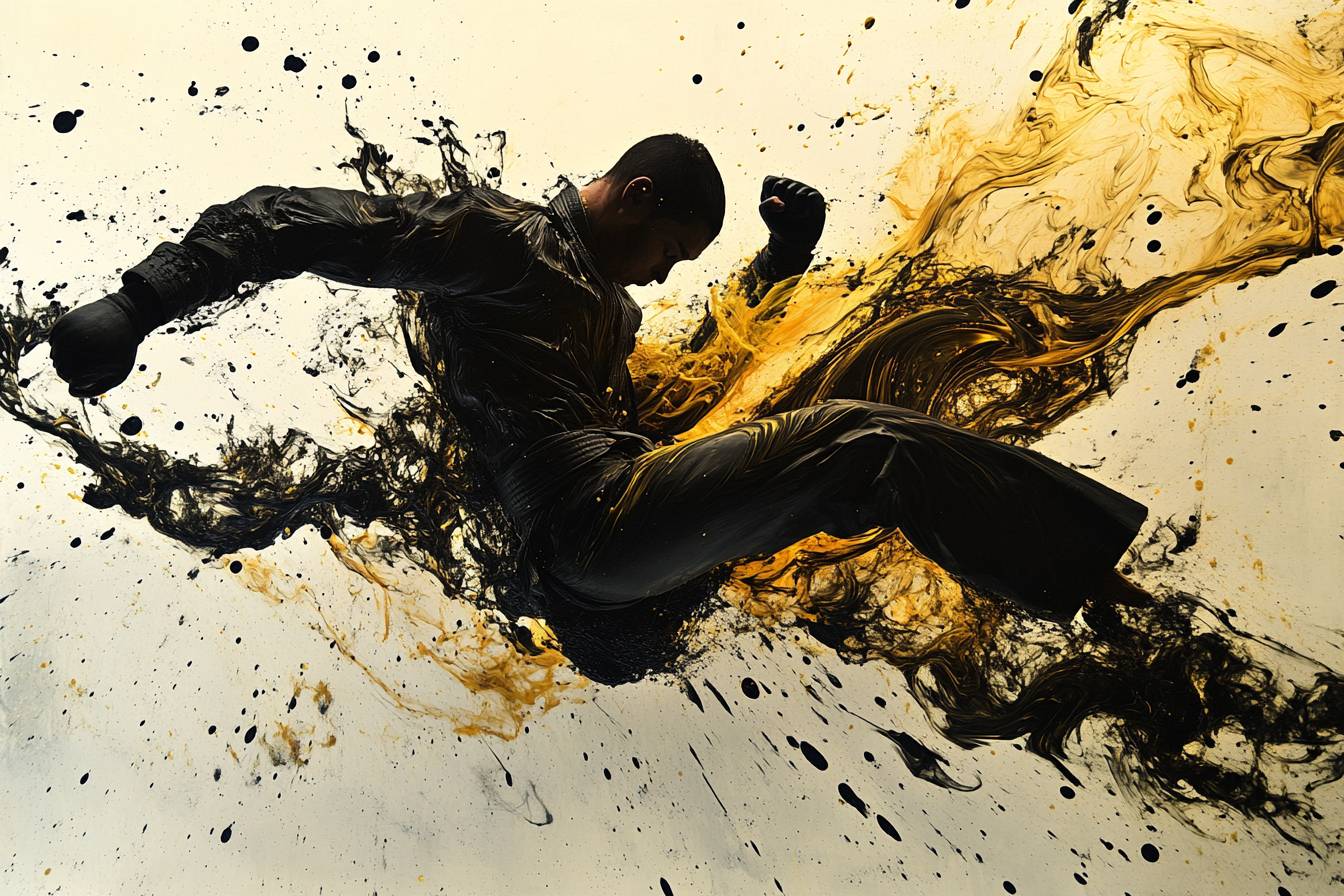 A Liquid Ink Splash Velocity of a martial artist, capturing the athlete mid-action amid dynamic splatters of fluid color. Use splashes of black and gold to form expressive silhouettes of bodies in motion, evoking the momentum and fluidity of competition --ar 3:2 --v 6.1