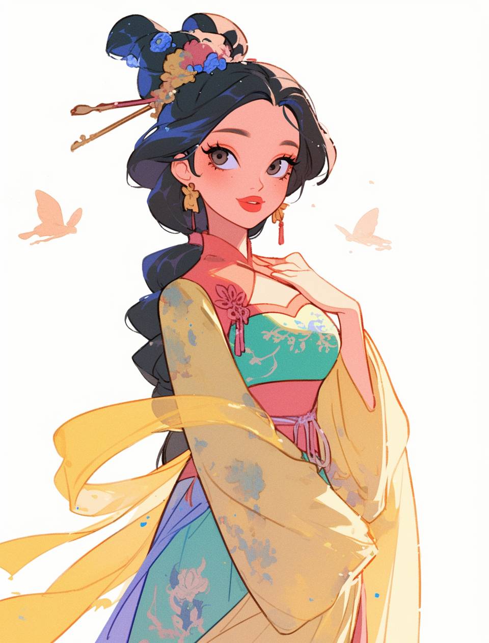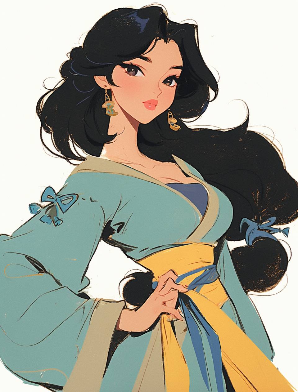 Disney-Prinzessin mit schwarzen Haaren und gelbem Gürtel, gekleidet in ein antikes chinesisches Kostüm im Cartoon-Stil.