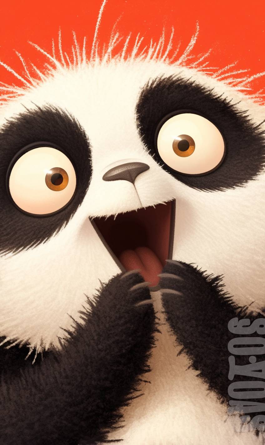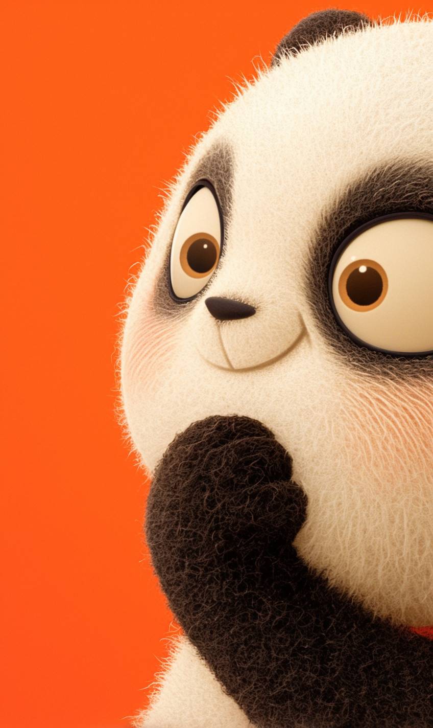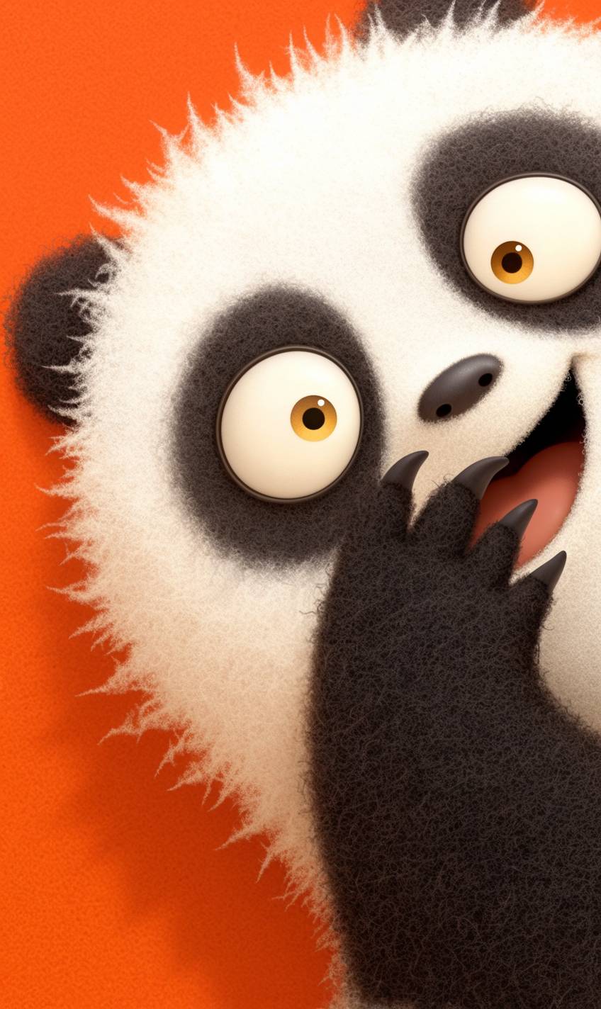 panda face,panda,eyes sparkling,mouth wide open in a joyful grin, happy expression, cute, excited. Pixar and children's bookillustration style close-up on red background, head looking at camera in 3/4 side view.wool felt fabric art. cute and funny character design in the style of Mo Willems. --ar 3:5 --profile anbi164 --stylize 400 --niji 6