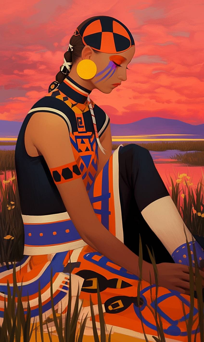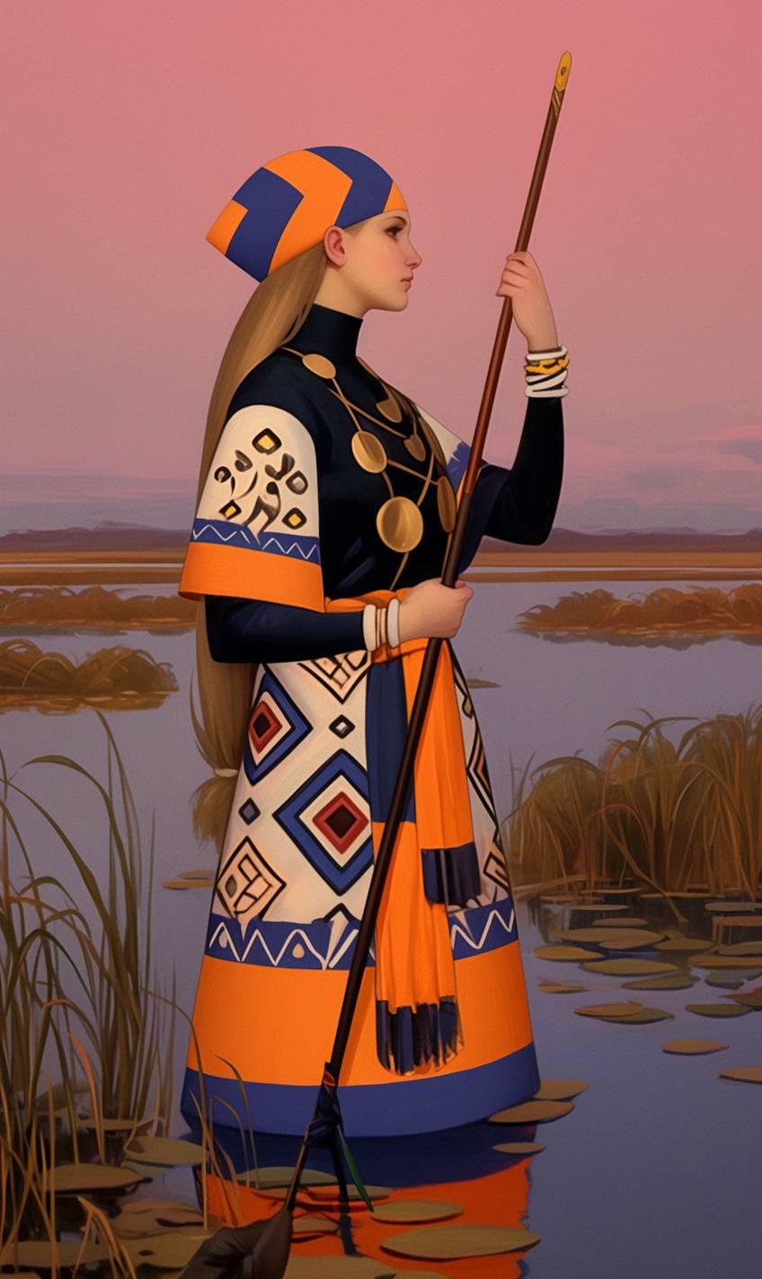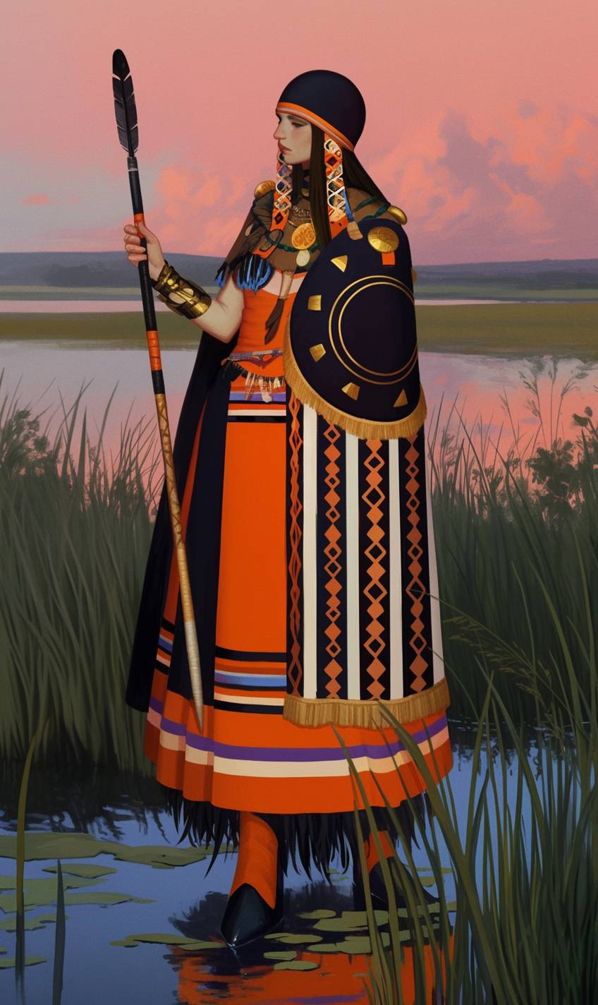 Porträt der Schamanen-Jägerin in den morgendlichen Sümpfen
