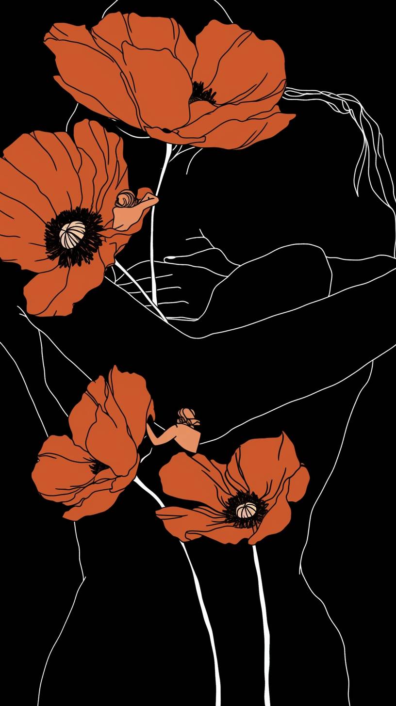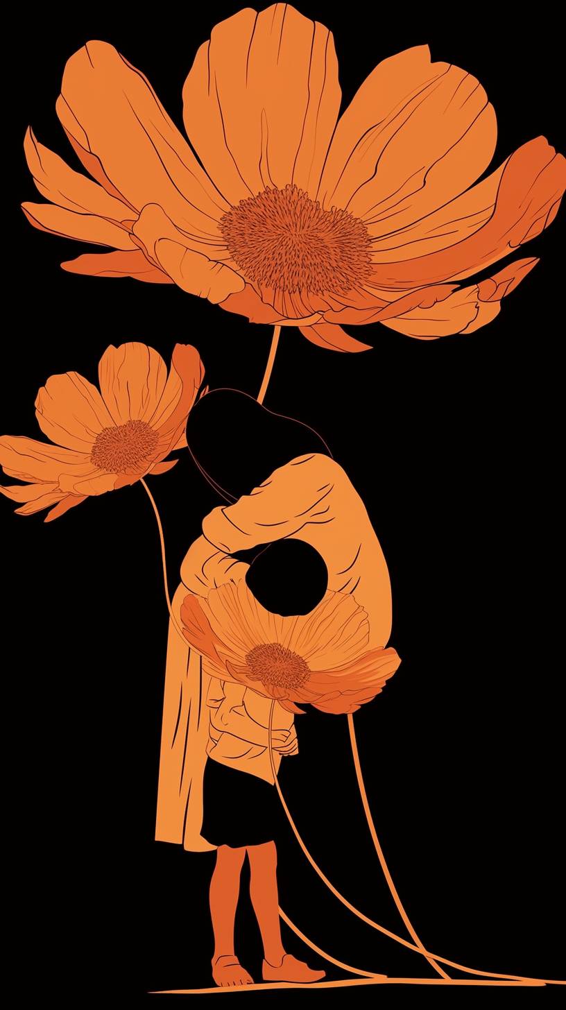 Minimalistisches Tattoo-Design mit einfachen Linien einer großen orangefarbenen Blume, einer traurigen Frau, die zwei kleinere orangefarbene Blumenjungen umarmt und hält, vor einem einfarbigen schwarzen Hintergrund.