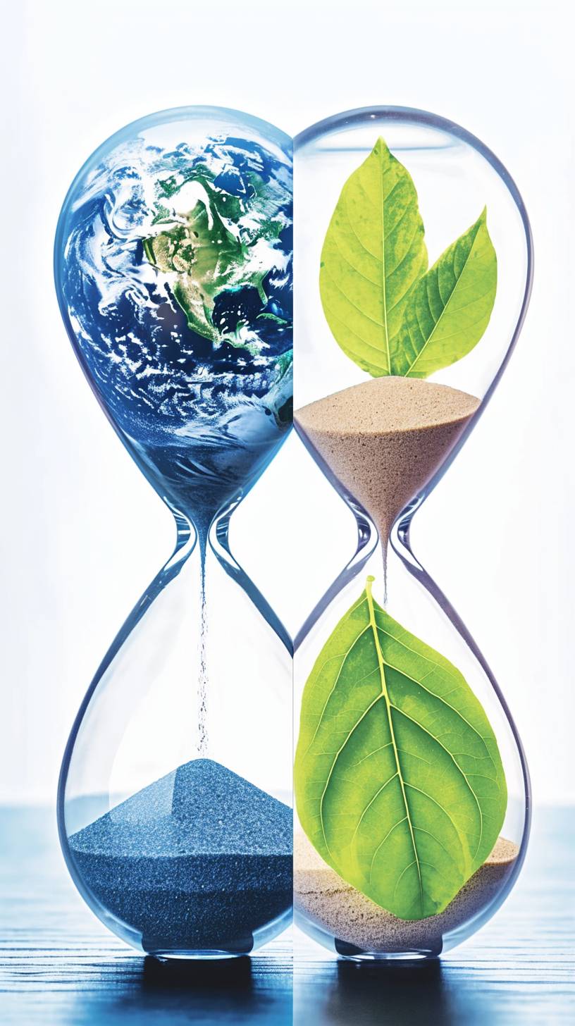 Ein fotorealistisches Bild einer Sanduhr, wobei die Sandkörner im Inneren die Farben der Erde annehmen. Die Sandkörner sind eine Mischung aus Blau, Grün, Braun und Weiß, die den Kontinenten, Ozeanen und Wolken des Planeten ähneln. Die Sanduhr hat ein elegantes Design, mit transparentem Glas und einer leichten Reflexion auf der darunter liegenden Oberfläche. Das Licht ist sanft und schafft einen natürlichen, realistischen Look, während die bunten Erdkörner durch die Sanduhr fließen.