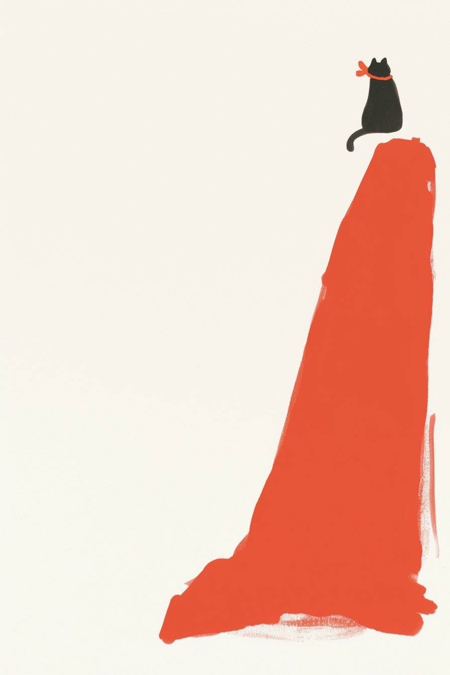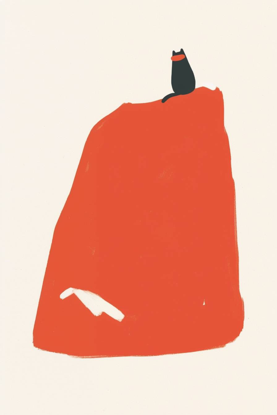 Eine schwarze Katze sitzt auf einem großen Berg, weißer Hintergrund.