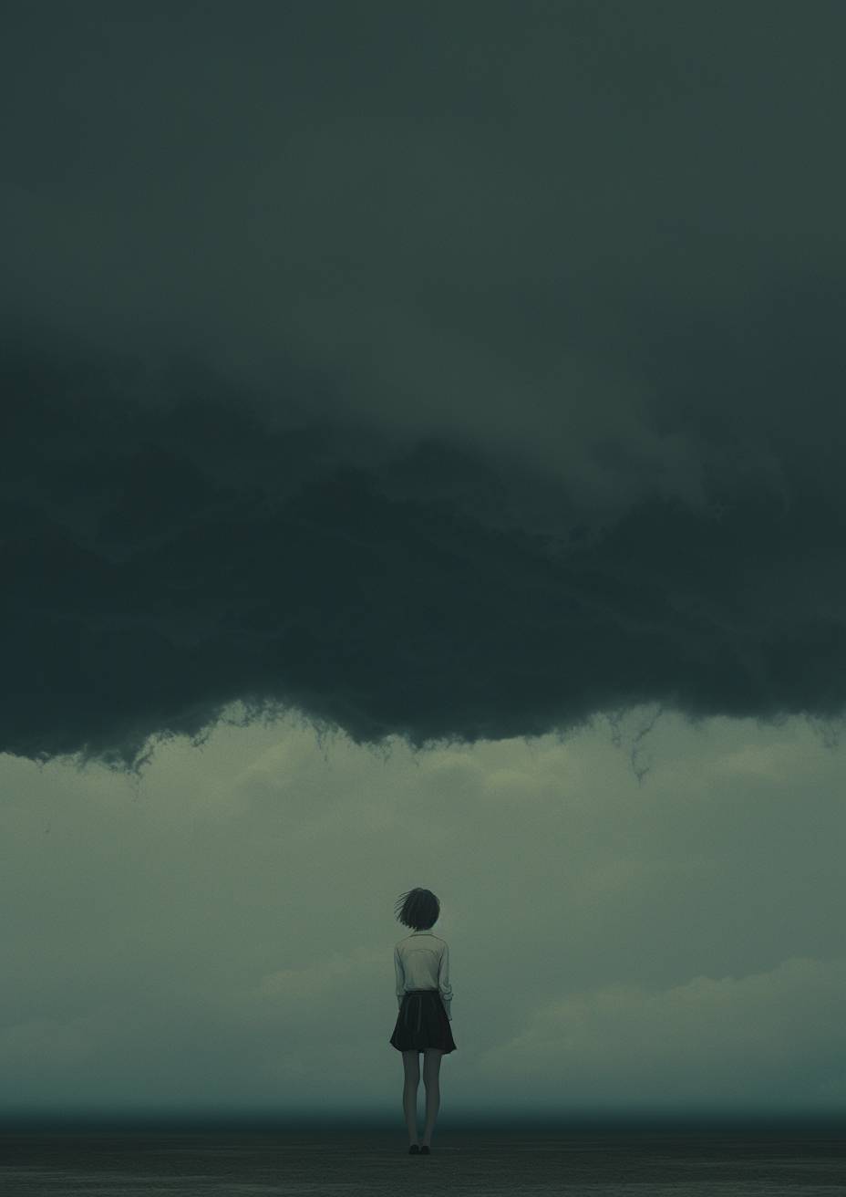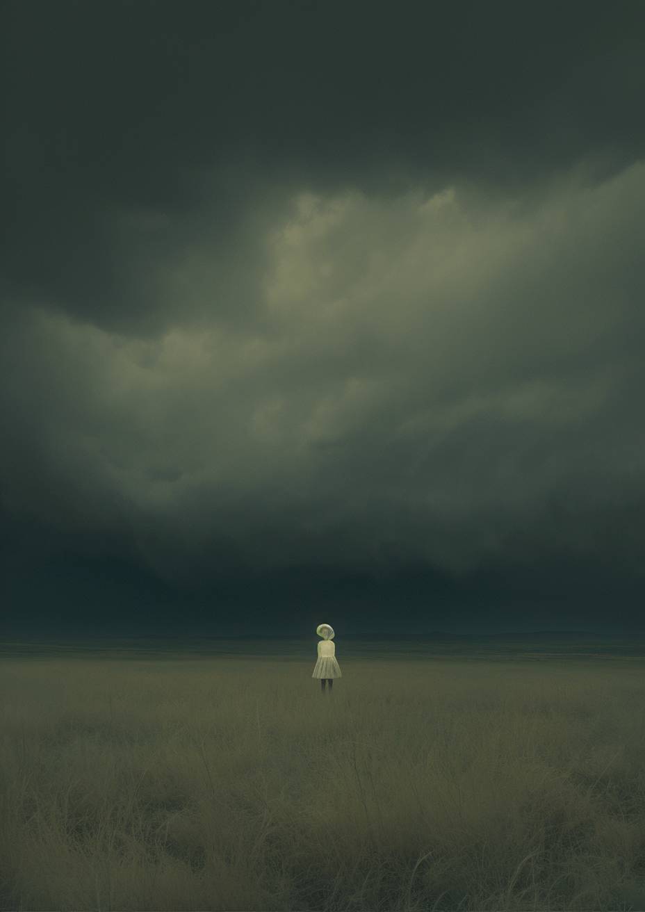 Front view of a Chinese girl standing on a vast grassland, looking deep into the distance, her eyes fixed on the horizon as a storm brews under the overcast sky. This image was captured by award-winning photographer Youssef Kash using a Hasselblad H6D-400c and a 90mm lens for dramatic and cinematic lighting effects. The image is 8K, Ultra HD, Super Resolution, offering a glimpse into a moment of intense emotion and the power of nature, high quality, Ultra HD 32K UHD with intricate detail --ar 5:7 --style raw --stylize 750 --niji 6