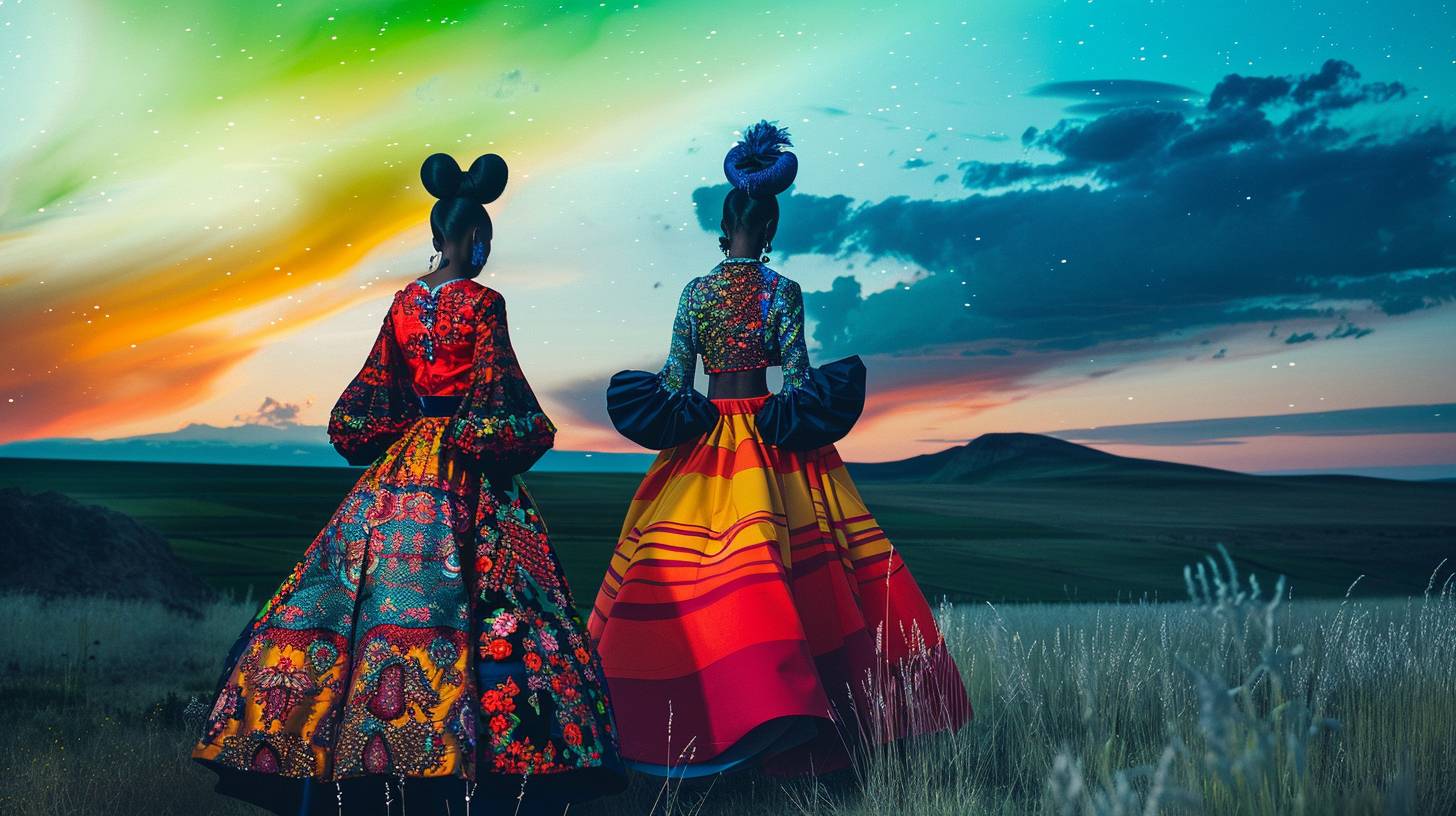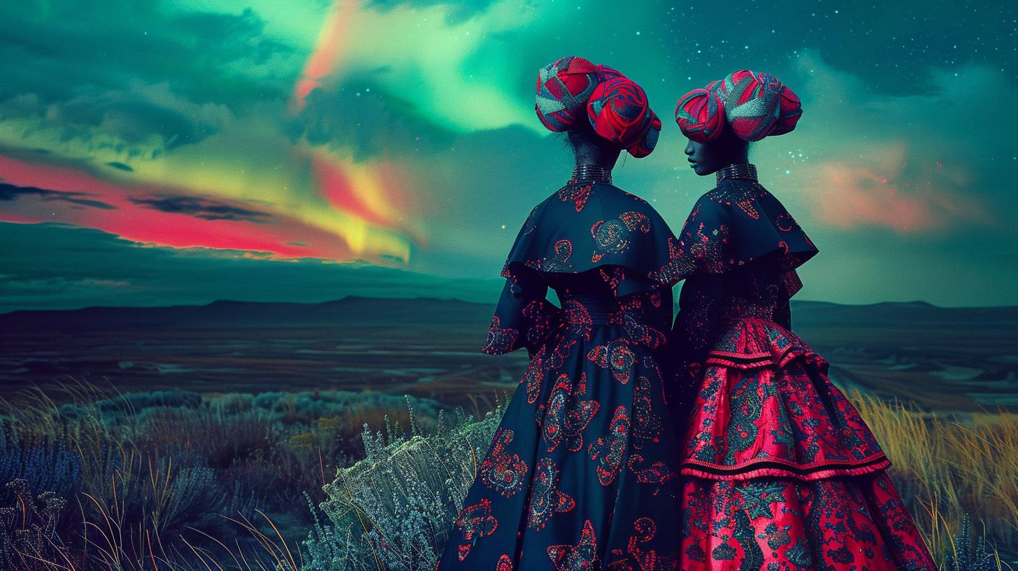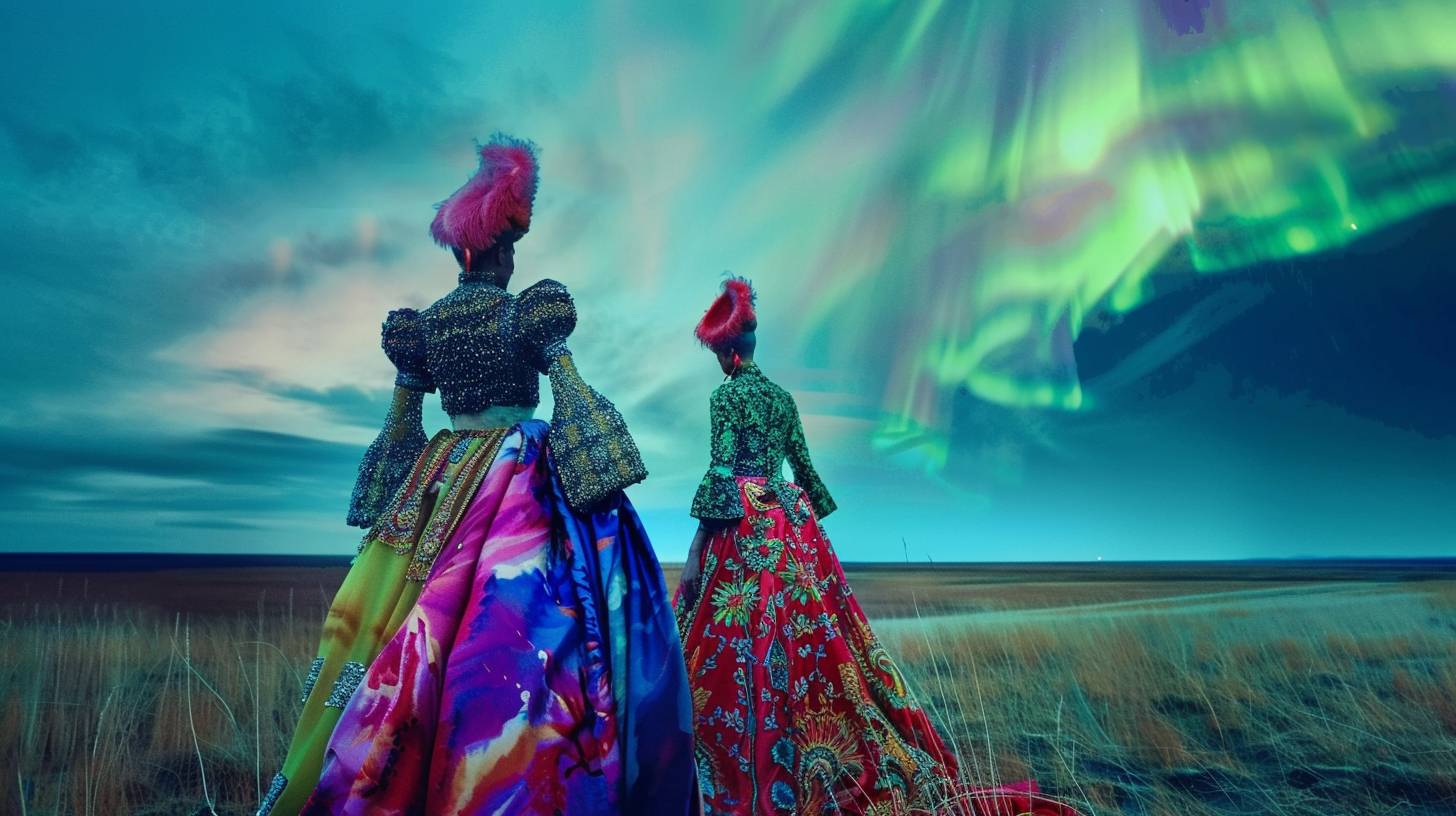 Haute-couture advertising campaign photographed by Erik Madigan Heck. Two models wearing Comme des Garcons Avant-Garde costume. Mongol steppe in background. Northern lights in sky --ar 16:9 --v 6.0