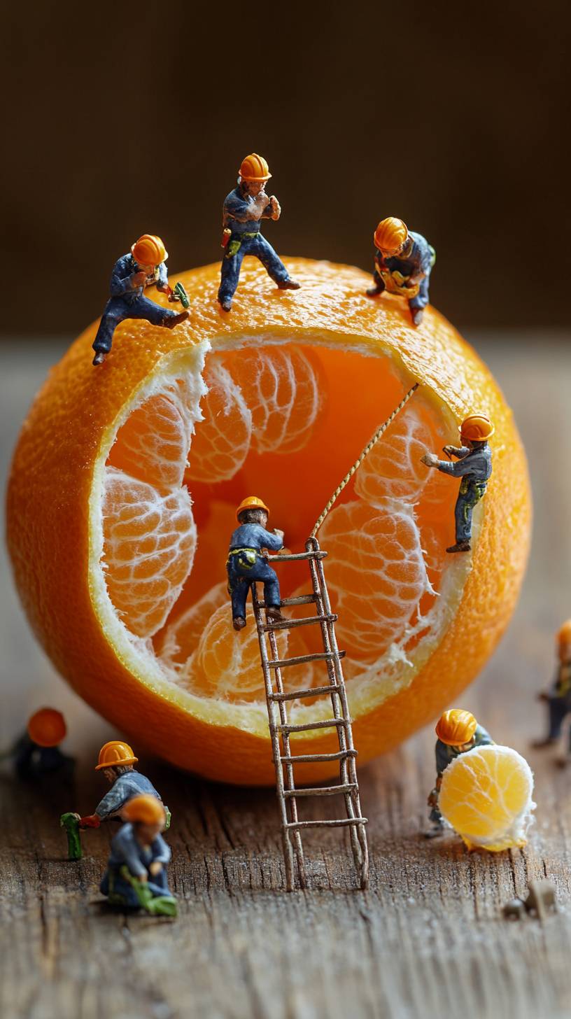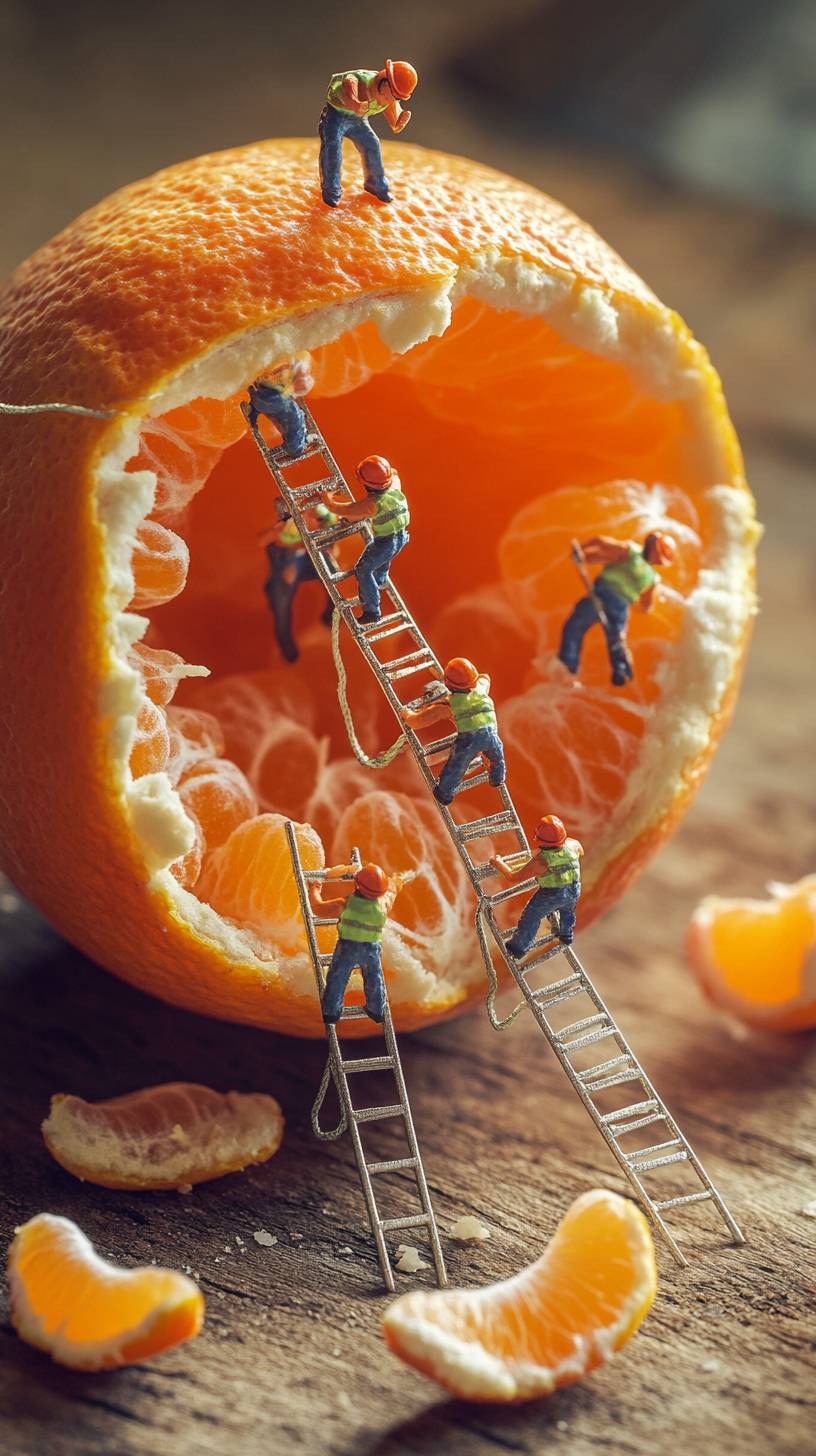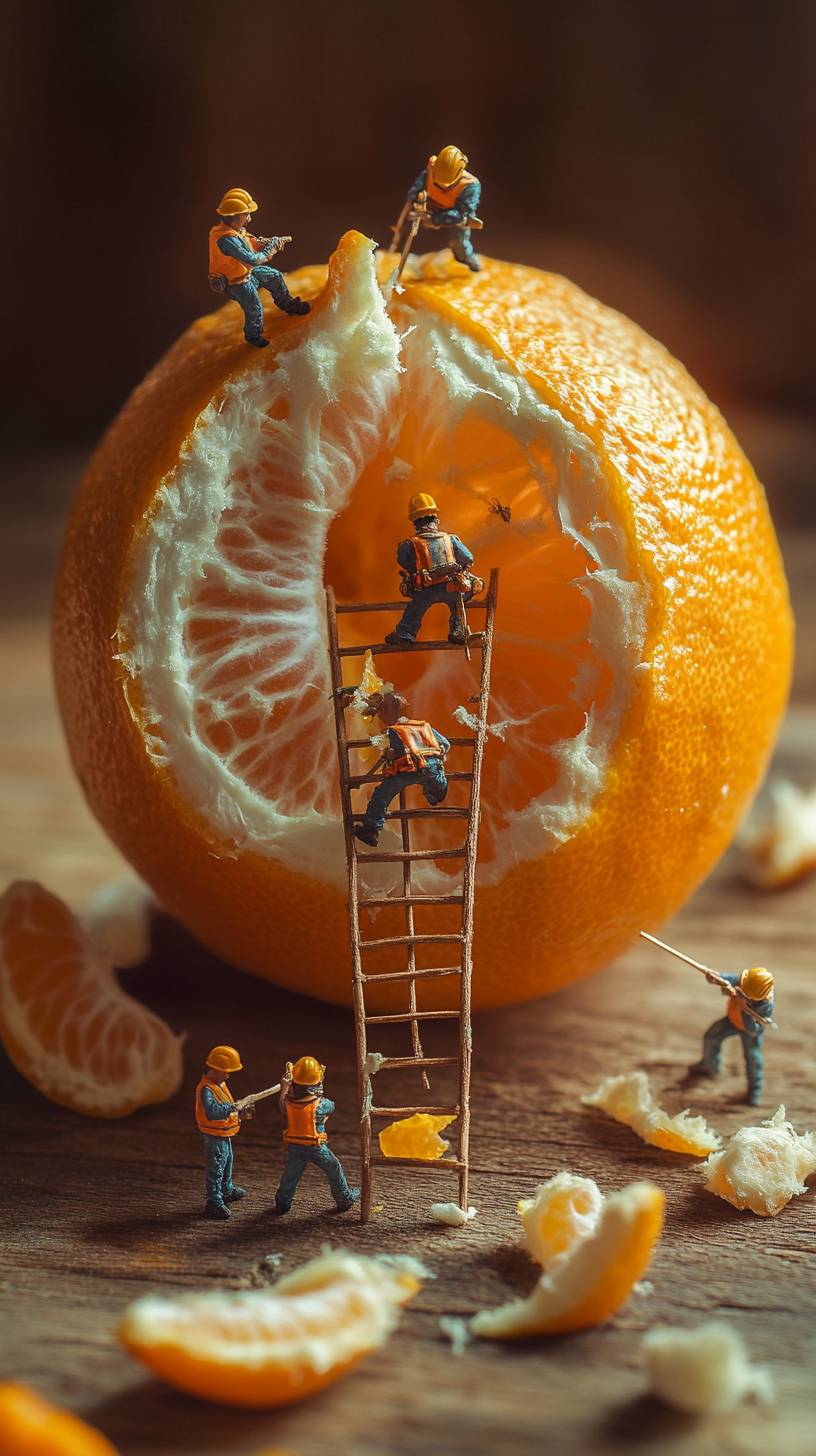 A macro shot of tiny construction workers peeling a giant clementine, with half of the peel already removed to reveal the juicy orange segments inside, workers climbing ladders and using tiny tools like scrapers and ropes, some standing on scaffolding built on the rind, vibrant fruit textures with realistic glistening pulp, set on a rustic wooden table, warm natural daylight streaming in from the side, shot with a Canon EOS R5, 100mm f/2.8 macro lens, vivid and juicy color palette --ar 9:16 --v 6.1