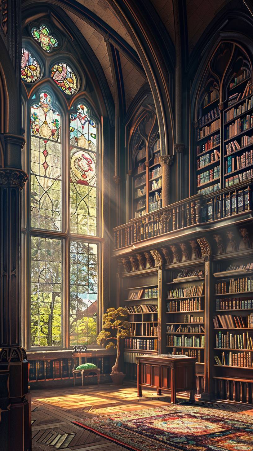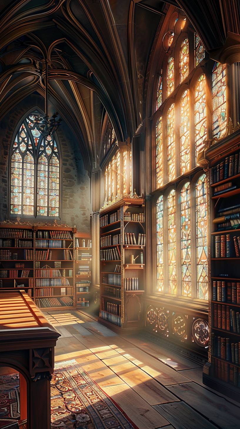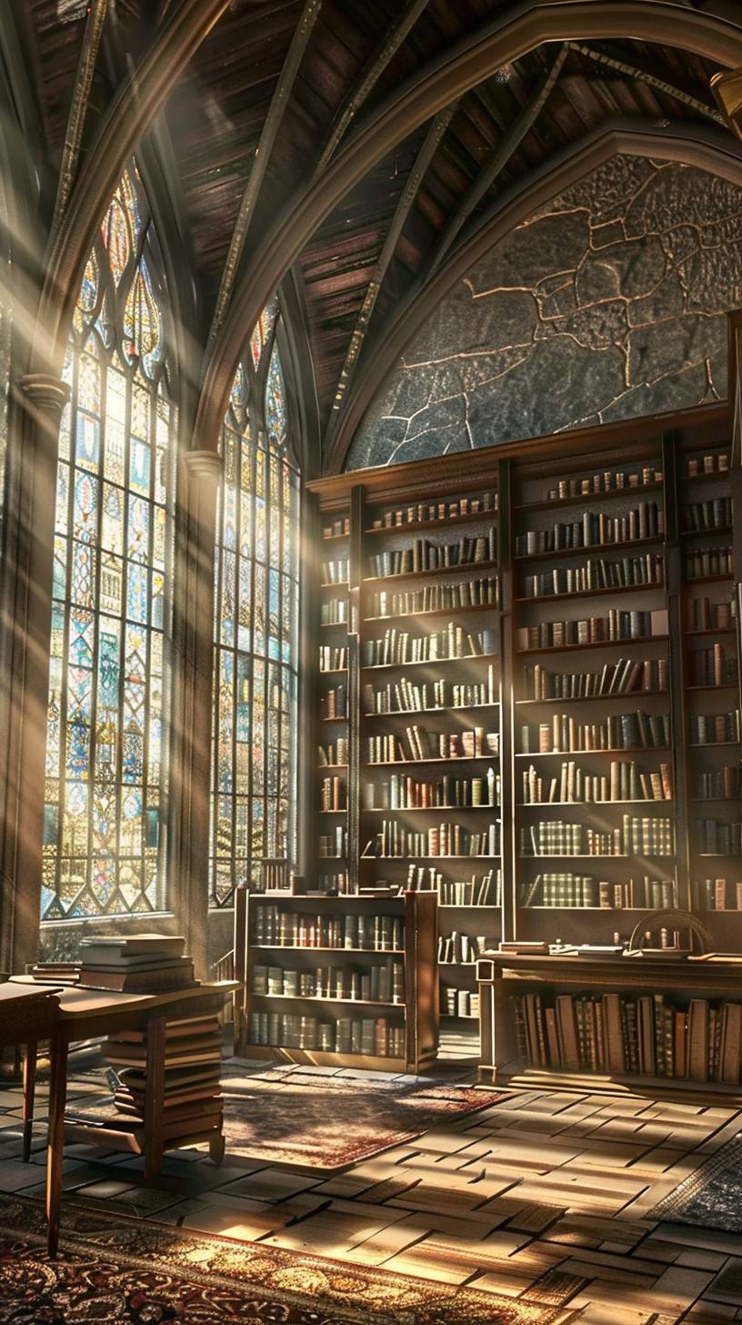 A historic library with tall bookshelves filled with ancient books. Sunlight streams through stained glass windows, illuminating the beauty of the space. In the style of an architectural photograph by James Gillray --v 6.0 --ar 9:16