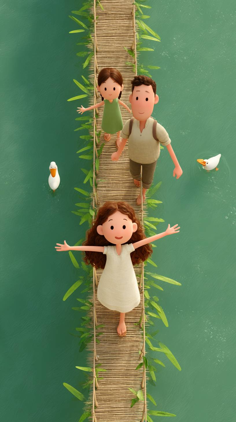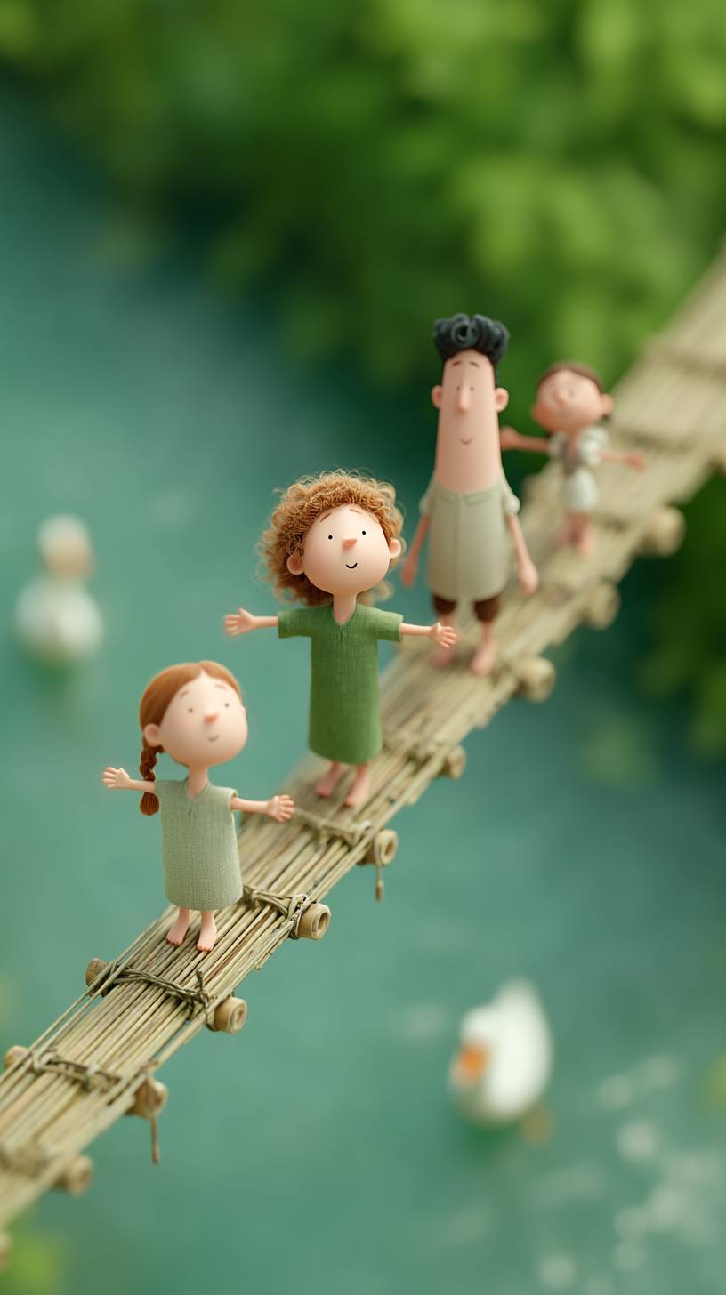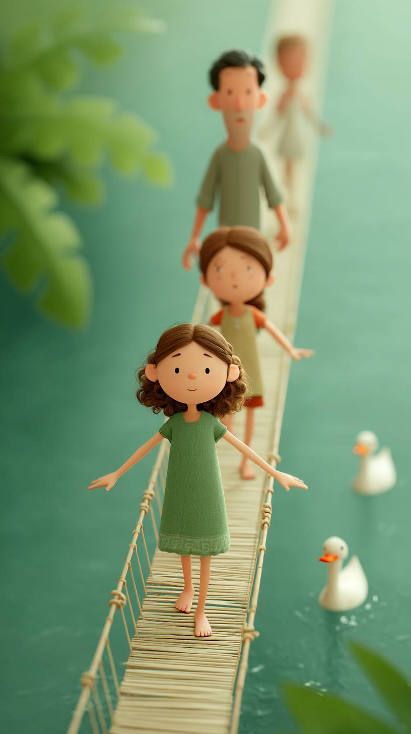 A whimsical Pixar-style scene of a group of children and two young adults carefully crossing a narrow bamboo bridge over a river in a Bangladeshi village. One girl with curly hair and a pink kurti stretches her arms for balance, while the man behind her jokes and pretends to wobble. Ducks swim below, and the lush banks overflow with greenery. Fun, charming, and filled with motion and life. --ar 9:16 --profile 2wrt9bh --stylize 500 --v 7.0