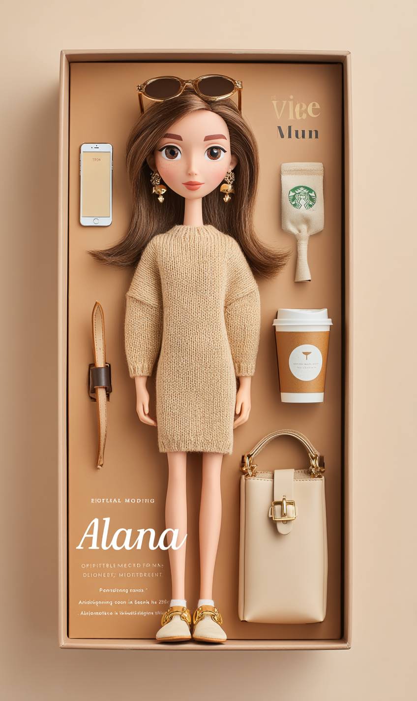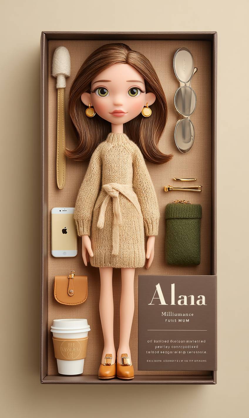 a hyperrealistic cartoon style doll in modern, expensive, and sleek packaging. the box is dark brown with cream writing. the title at the top of the box says "Alana" and in smaller writing underneath the tagline says "Millenial Mum". The full body doll is in her 30s and she is dressed in a casual long beige dress accessorized with gold earrings and designer shoes. She has long brown hair and brown eyes. The box contains additional accessories such as a smartphone, purse, and coffee cup. Soft shadows, professional color grading. --v 7.0 --ar 3:5 --s 750