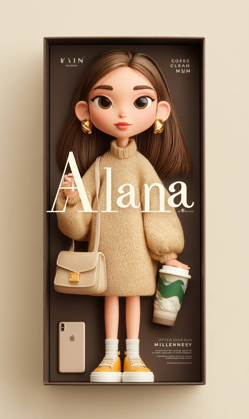 Eine hyperrealistische Cartoon-Stil-Puppe in moderner, teurer und eleganter Verpackung. Die Box ist dunkelbraun mit cremefarbener Schrift. Der Titel oben auf der Box lautet "Alana" und darunter steht in kleinerer Schrift der Slogan "Millennial Mum". Die Ganzkörperpuppe ist in ihren 30ern und trägt ein lässiges, langes beiges Kleid, kombiniert mit goldenen Ohrringen und Designerschuhen. Sie hat lange braune Haare und braune Augen. Die Box enthält zusätzliches Zubehör wie ein Smartphone, eine Handtasche und eine Kaffeetasse. Sanfte Schatten, professionelle Farbkorrektur.