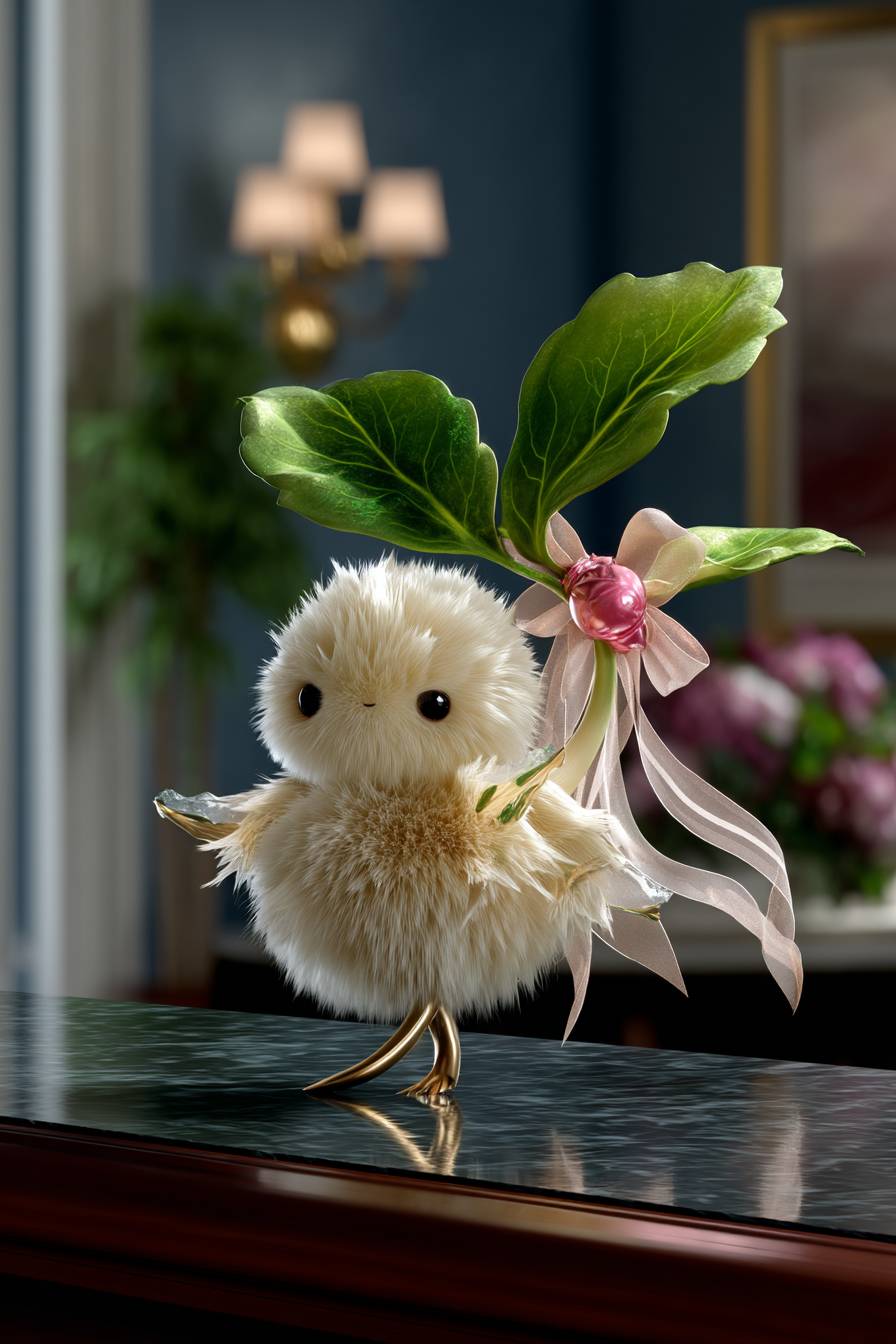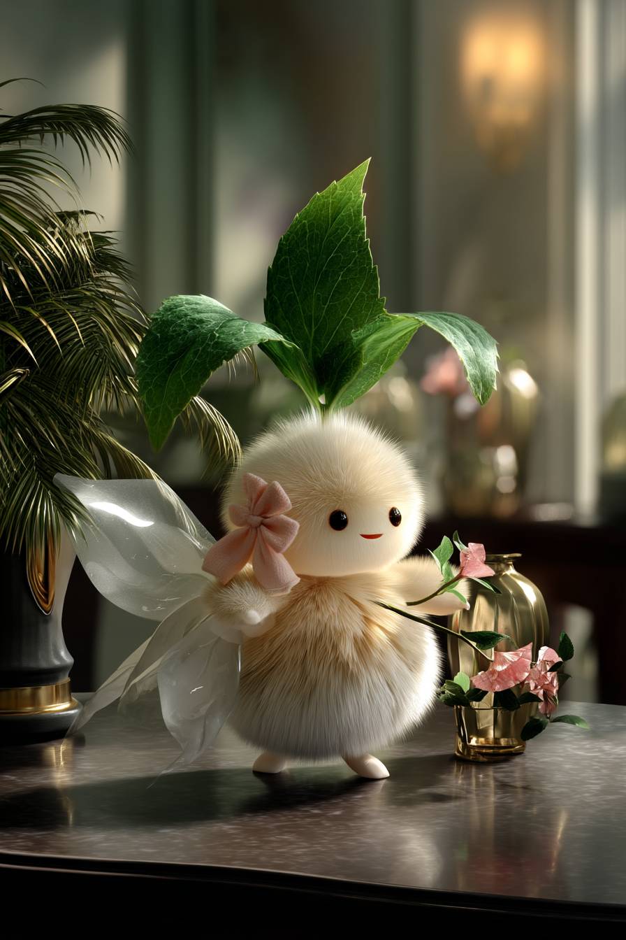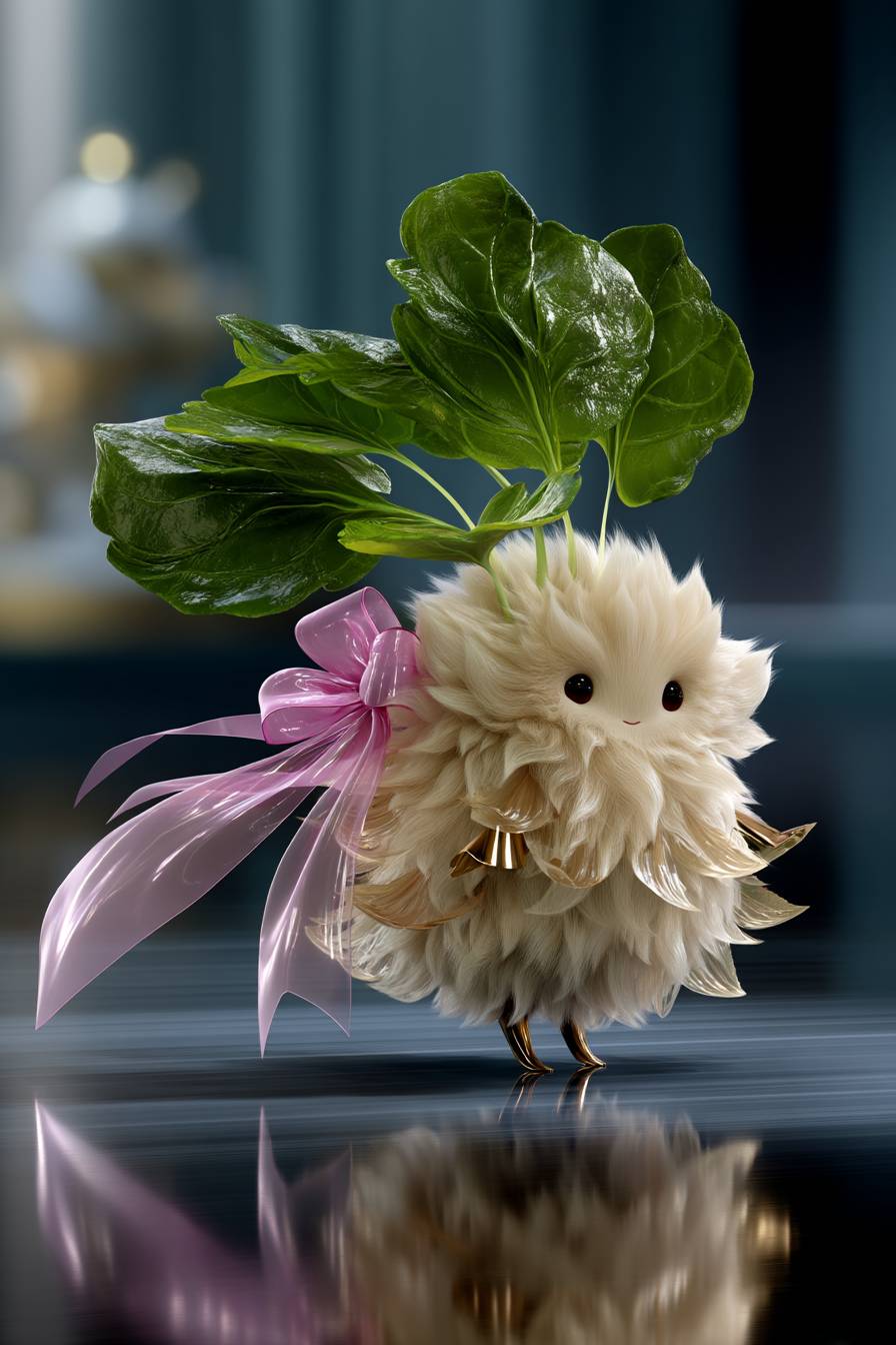 a super cute bean sprout character, with a soft beige fluffy body, round chubby cheeks, and tiny limbs. On its head grows a small green leaf with a pink tiny bow tied on it. --v 7.0 --ar 2:3 --s 750 --p semv7u6
