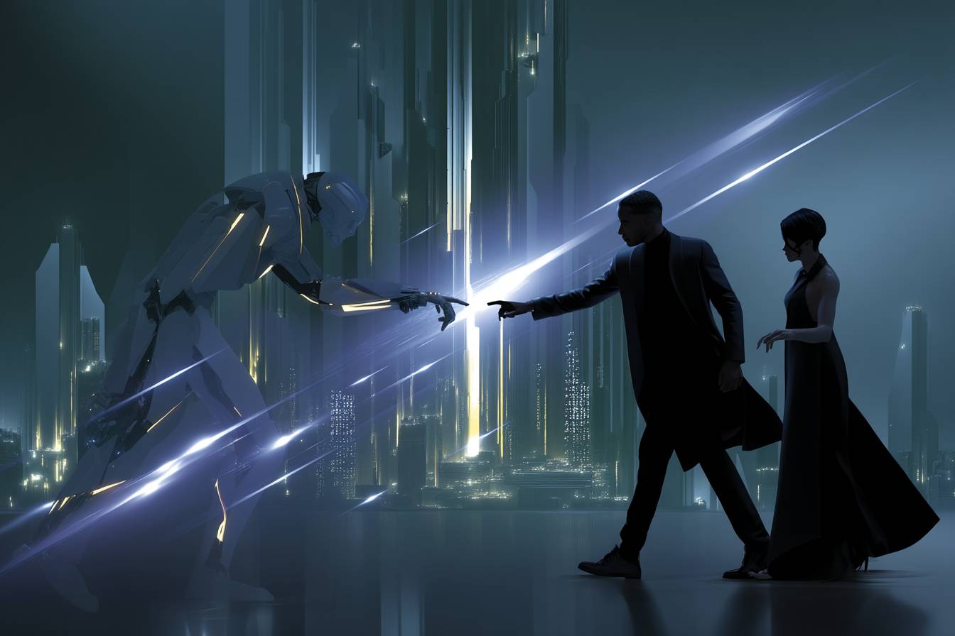 A Cyborg hand reaching out to touch the finger of an adult human, with digital data flowing between them in a dark blue background. --ar 3:2 --v 7.0 --s 750 --p semv7u6