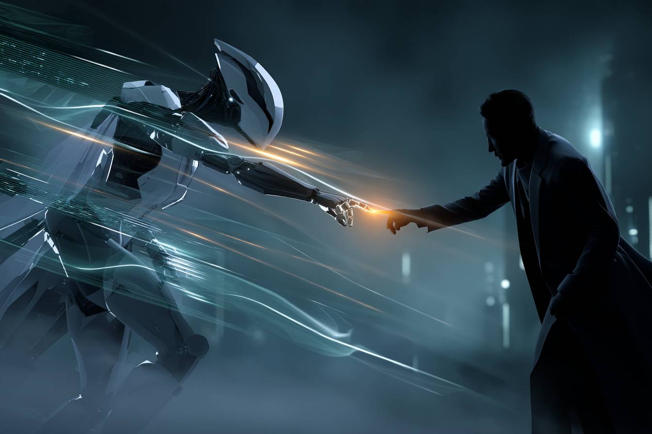 Eine Cyborg-Hand streckt sich aus, um den Finger eines erwachsenen Menschen zu berühren, während digitale Daten zwischen ihnen auf einem dunkelblauen Hintergrund fließen.
