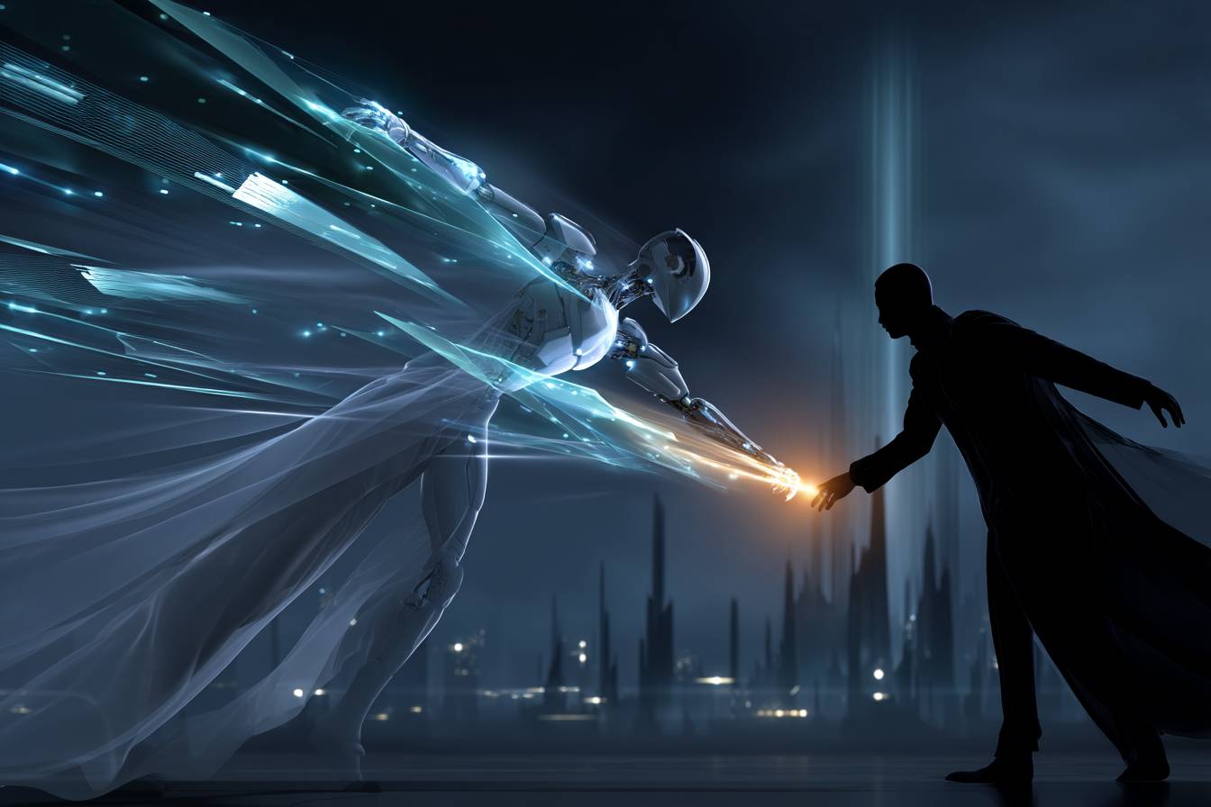 Eine Cyborg-Hand greift danach, den Finger eines erwachsenen Menschen zu berühren, während digitale Daten zwischen ihnen in einem dunkelblauen Hintergrund fließen.