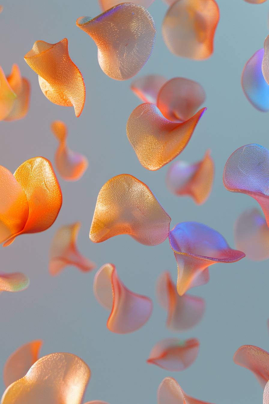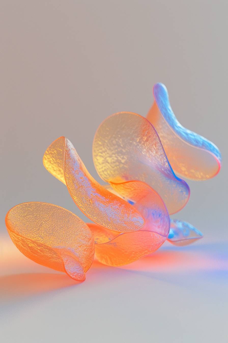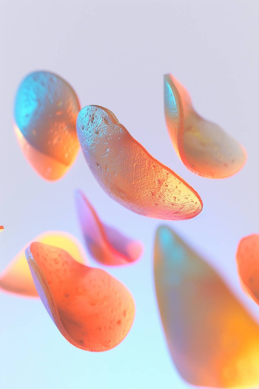 3D Kartoffelchips, die in der Luft schweben, aus holographischem transparentem Glas, vor weißem Hintergrund.