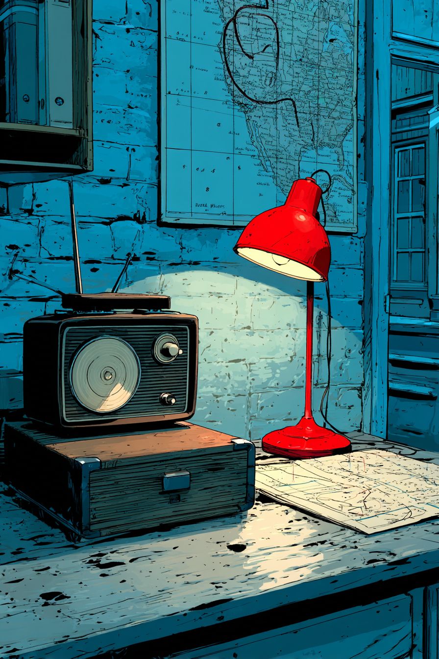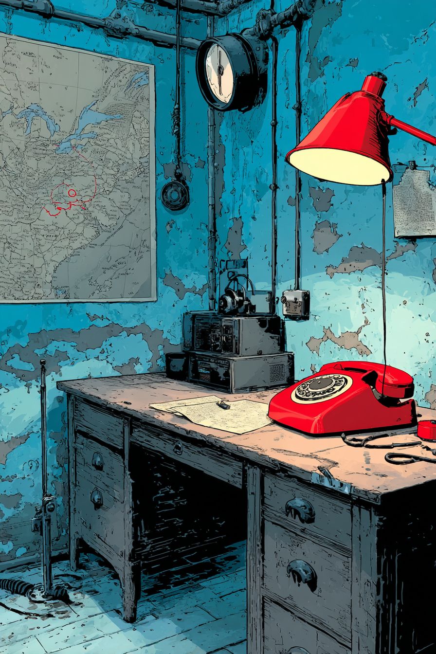 A comic book image in the 1950s EC comic style of a radio bunker lit only by one red desk lamp. Morse signals tap through the speaker. A map of North America is marked with circle --ar 2:3 --stylize 350 --v 7.0