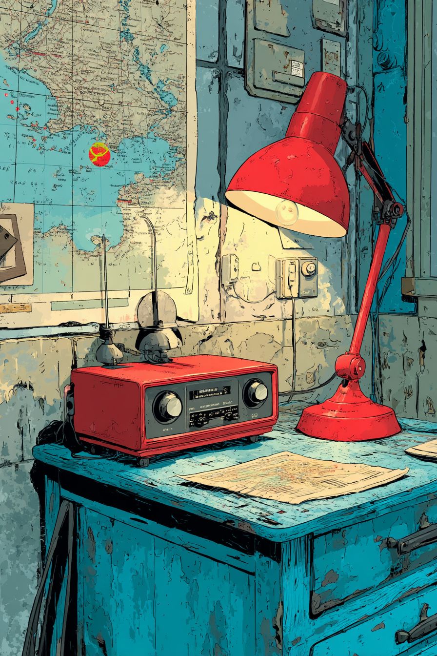 Ein Comic-Bild im EC-Stil der 1950er Jahre von einem Radio-Bunker, der nur von einer roten Schreibtischlampe beleuchtet wird, mit Morsezeichen, die durch den Lautsprecher tappen, und einer markierten Karte von Nordamerika.