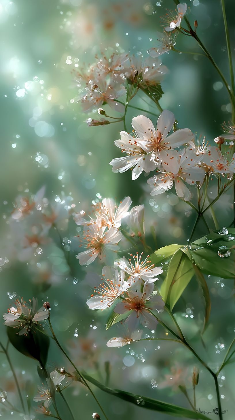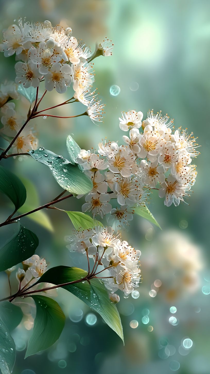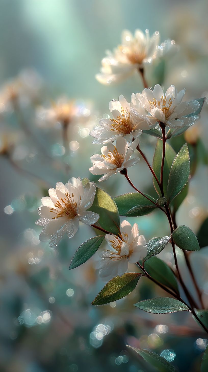 Fresh and serene summer landscape with soft, dewy flowers in the early summer morning, delicate green leaves, soft sunlight, ethereal tones, light and dreamy atmosphere, floral and leaf motifs, light bokeh effects, minimalistic and elegant, bright and fair color tones, white and pastel accents, no text, aspect ratio --ar 9:16 --stylize 250 --v 7.0