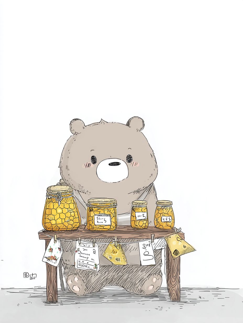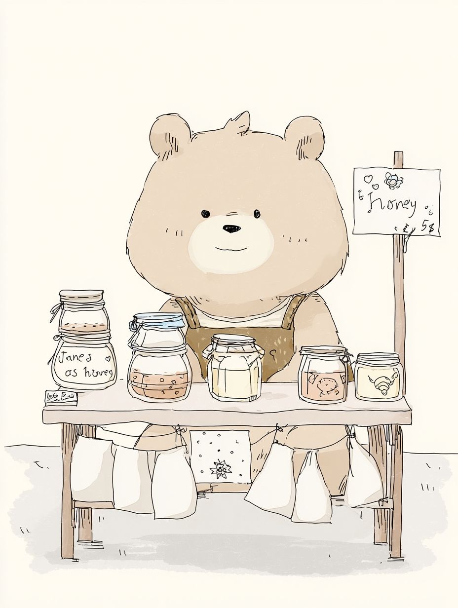 Eine Illustration eines Bären, der Gläser Honig an einem Stand verkauft. Es sollte ein Schild geben, auf dem steht 'Gläser Honig, 5 Cent'. Der Bär sollte eine Schürze mit einem Wabenmuster tragen.