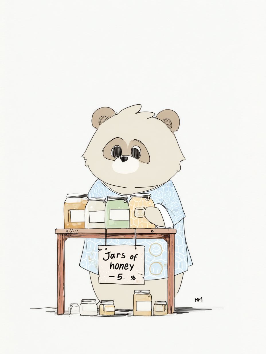 an illustration of a bear selling jars of honey from a stand. should be a sign that says "jars of honey, 5 cents." bear should be wearing an aprohn with a honeycomb pattern. --ar 3:4 --profile fsgq962 --stylize 200 --v 7.0