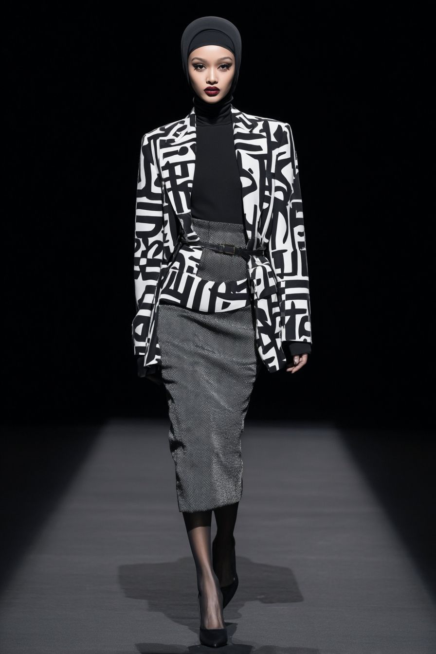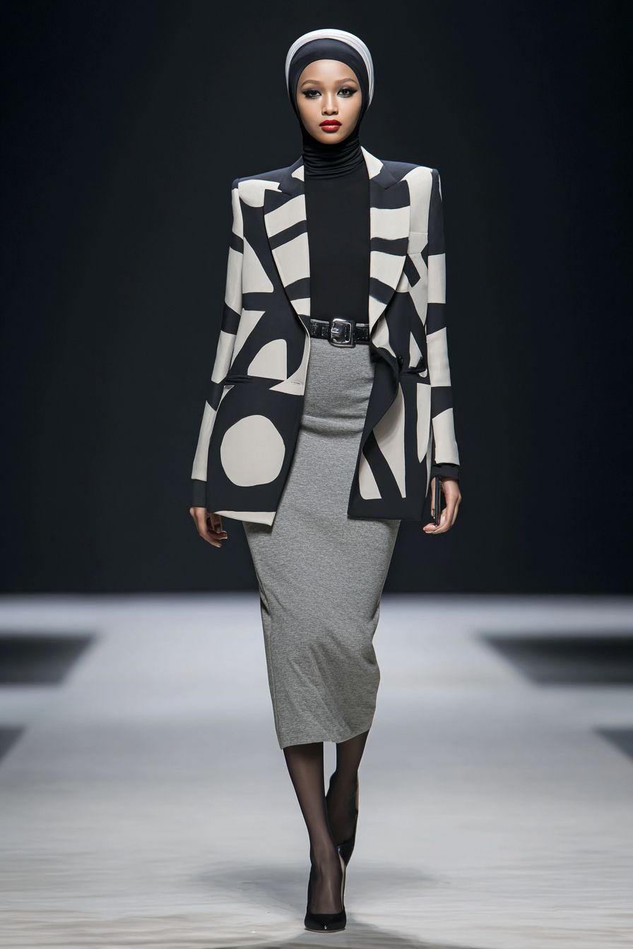 Ein attraktives muslimisches Model trägt ein retro-oversized Blazer mit grafischem Druck, einen schwarzen Rollkragenpullover und einen grauen Bleistiftrock auf dem Vogue-Laufsteg