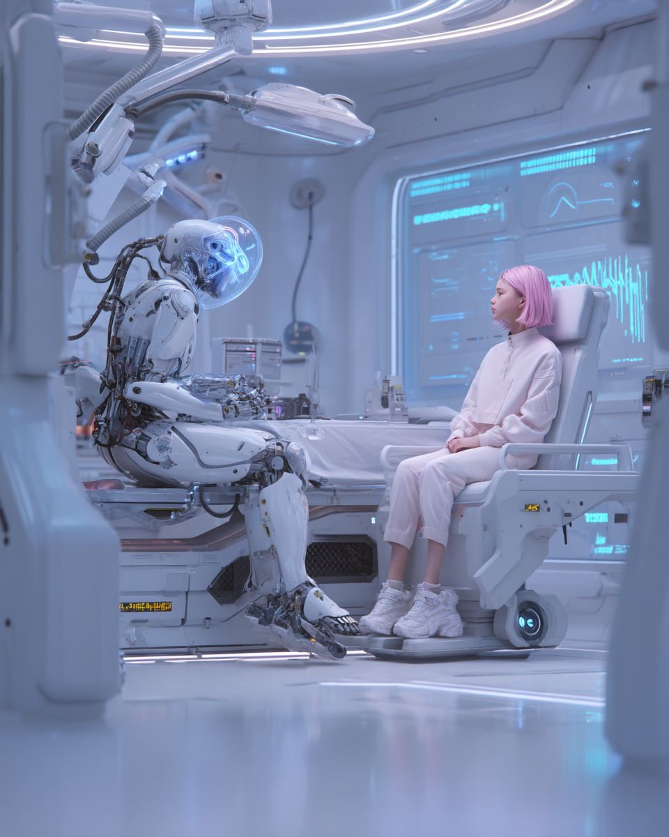 Eine junge Patientin mit rosa Haaren ruht auf einem futuristischen medizinischen Bett, während ein Arzt und eine Roboter-Krankenschwester ihr helfen