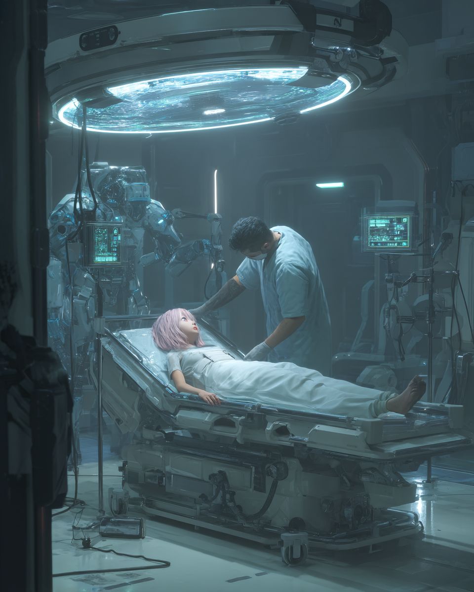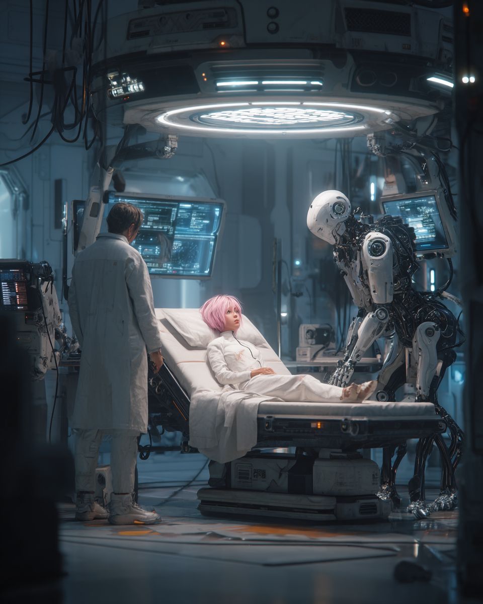 a young female patient with light pink hair, appearing around early childhood, resting on a futuristic medical bed wearing simple patient clothes, inside a sleek sci-fi hospital operating room, advanced glowing medical devices around her, a doctor with cybernetic implants adjusting equipment, robot nurse assisting, soft cold lighting, photorealistic, cinematic, emotionally evocative atmosphere --ar 4:5 --v 7.0