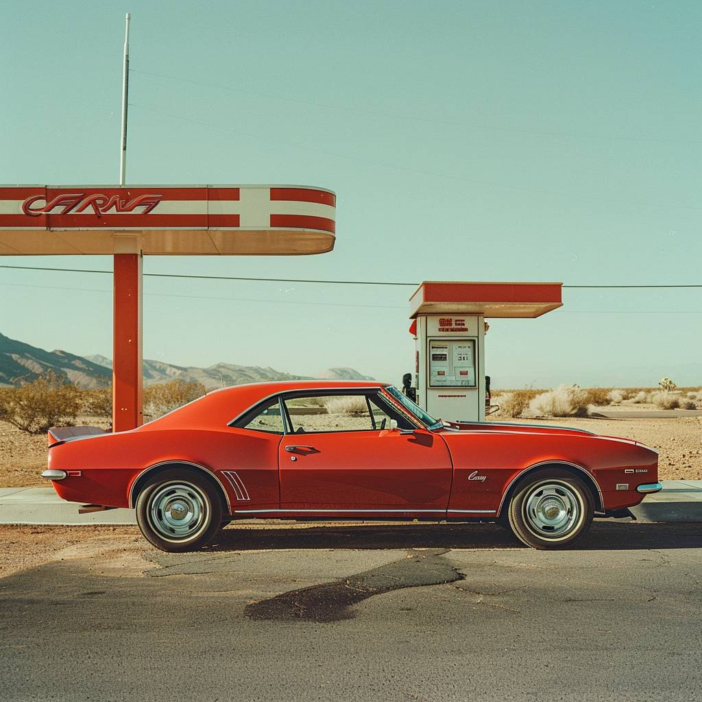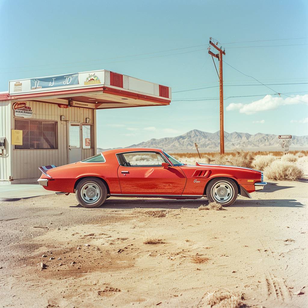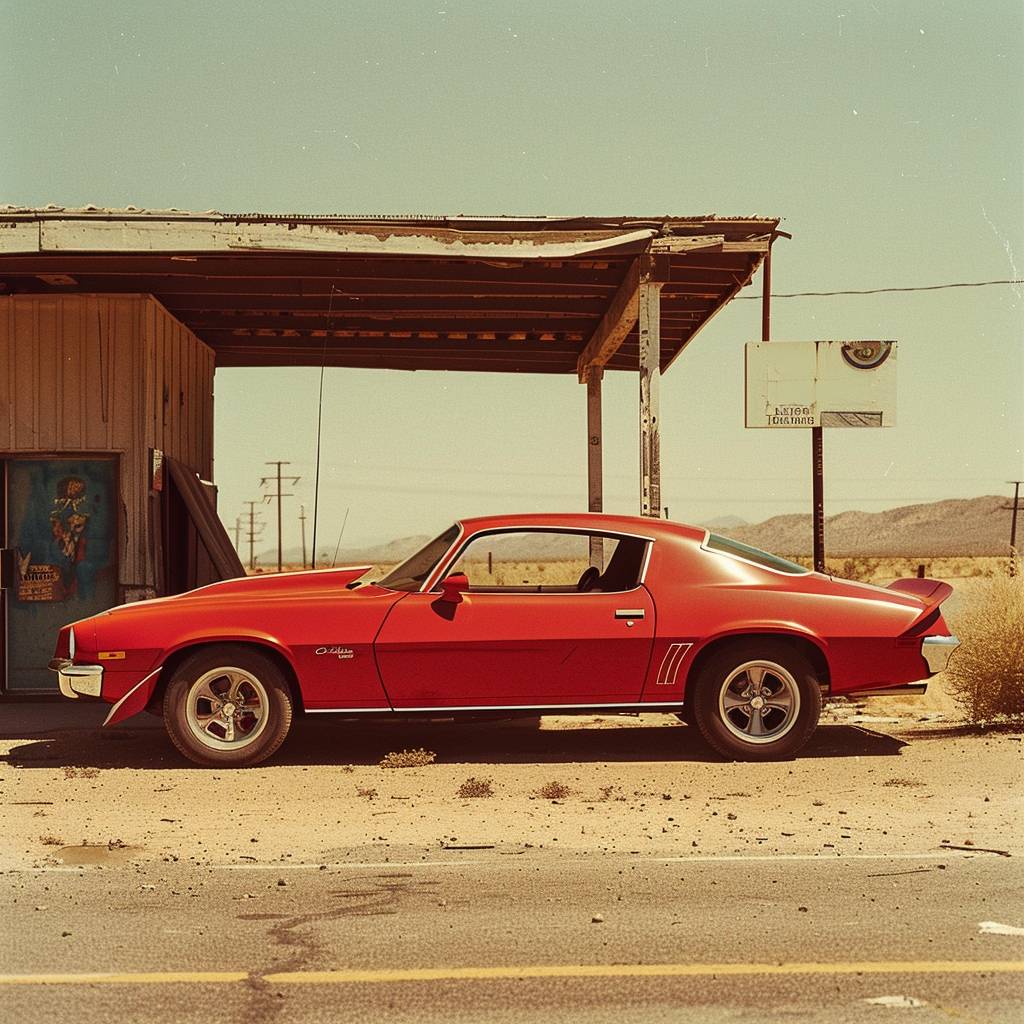 side view of a retro red camaro | parked outside a desert gas station | vintage Kodak shot | dusty environment --v 6.0