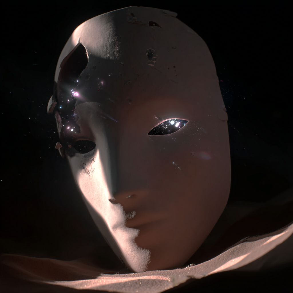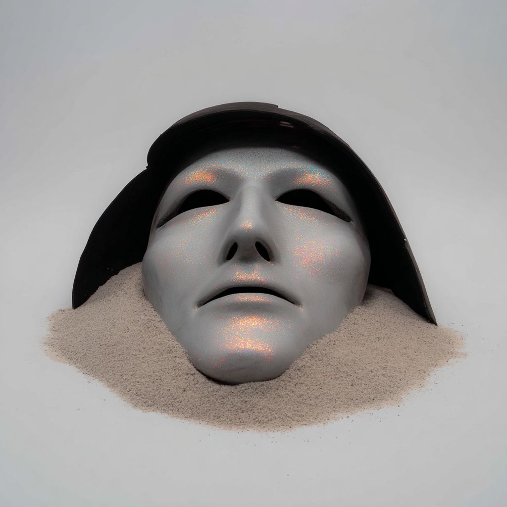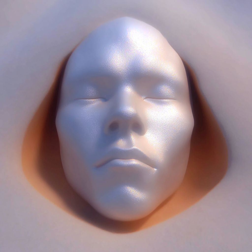 Eine glatte, blasse keramische humanoide Maske, die teilweise im hellen Aschesand vergraben ist. Leichte Irideszenz. Kein Gesichtsausdruck. Leer.