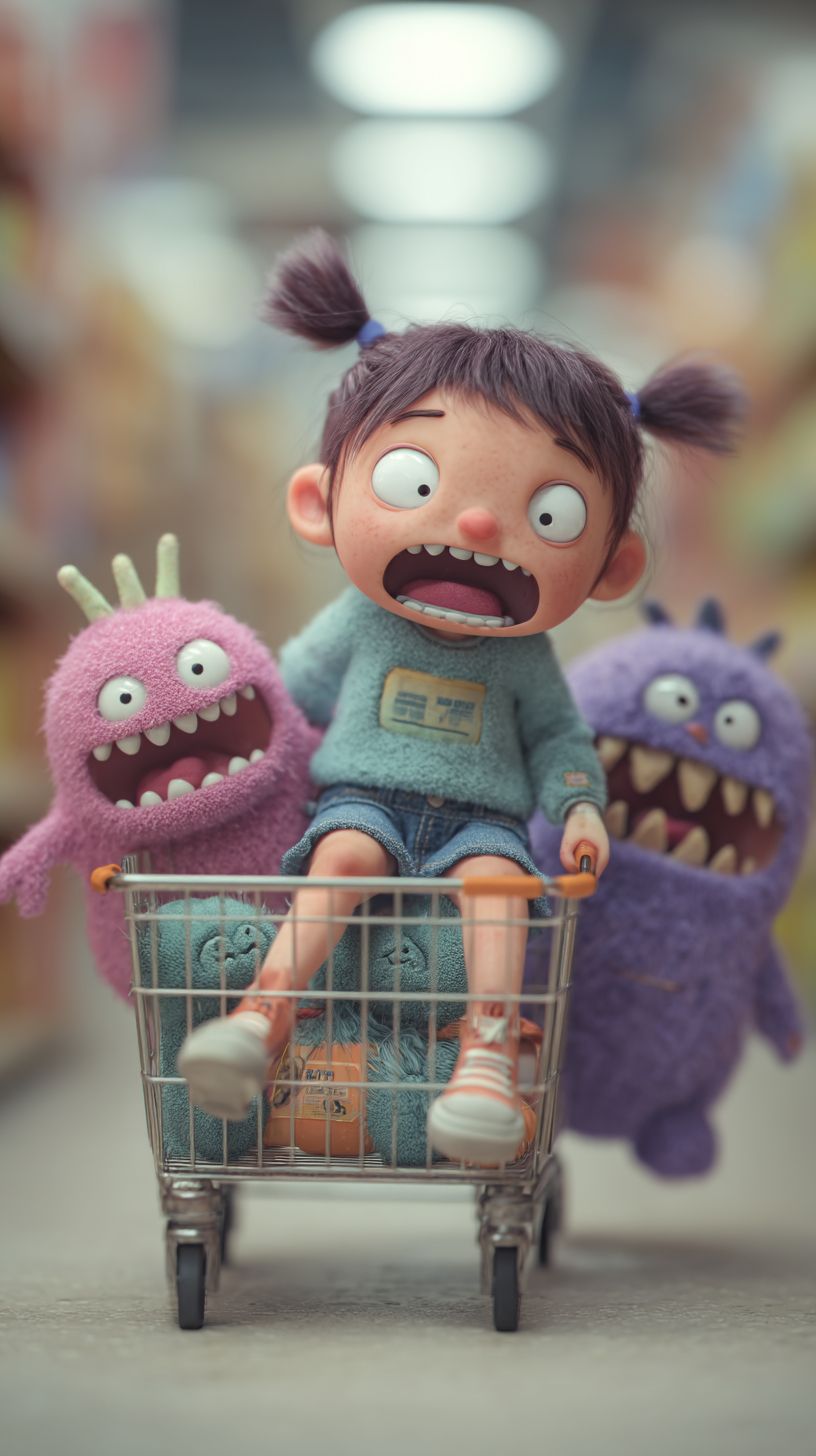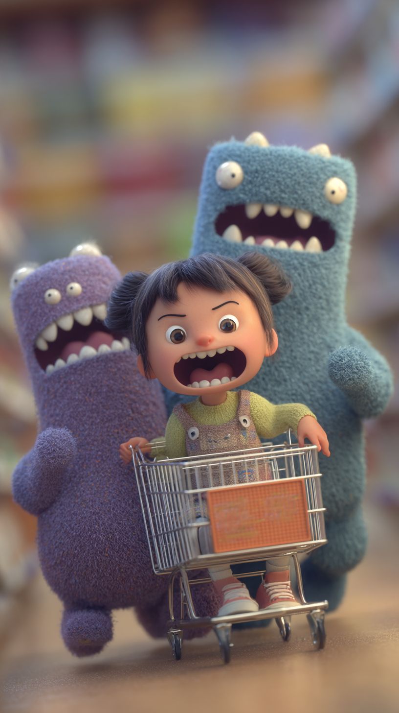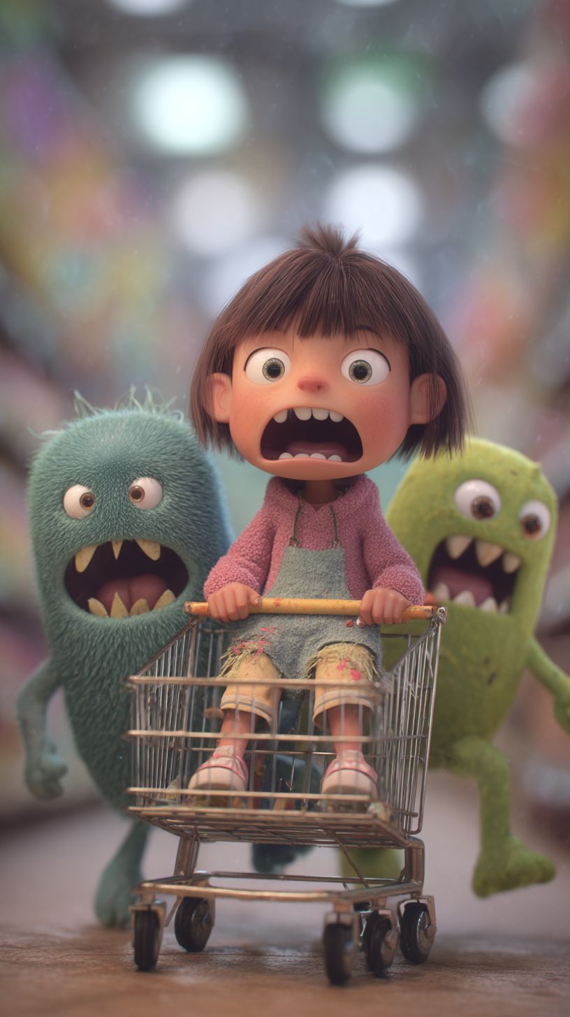 3D Pixar-style inspired cartoon of a girl sitting in a shopping cart and screaming in fear, 2 bright and funny monsters are running after the girl, super realistic, 8k --ar 9:16 --v 7.0 --p u4rmxcf