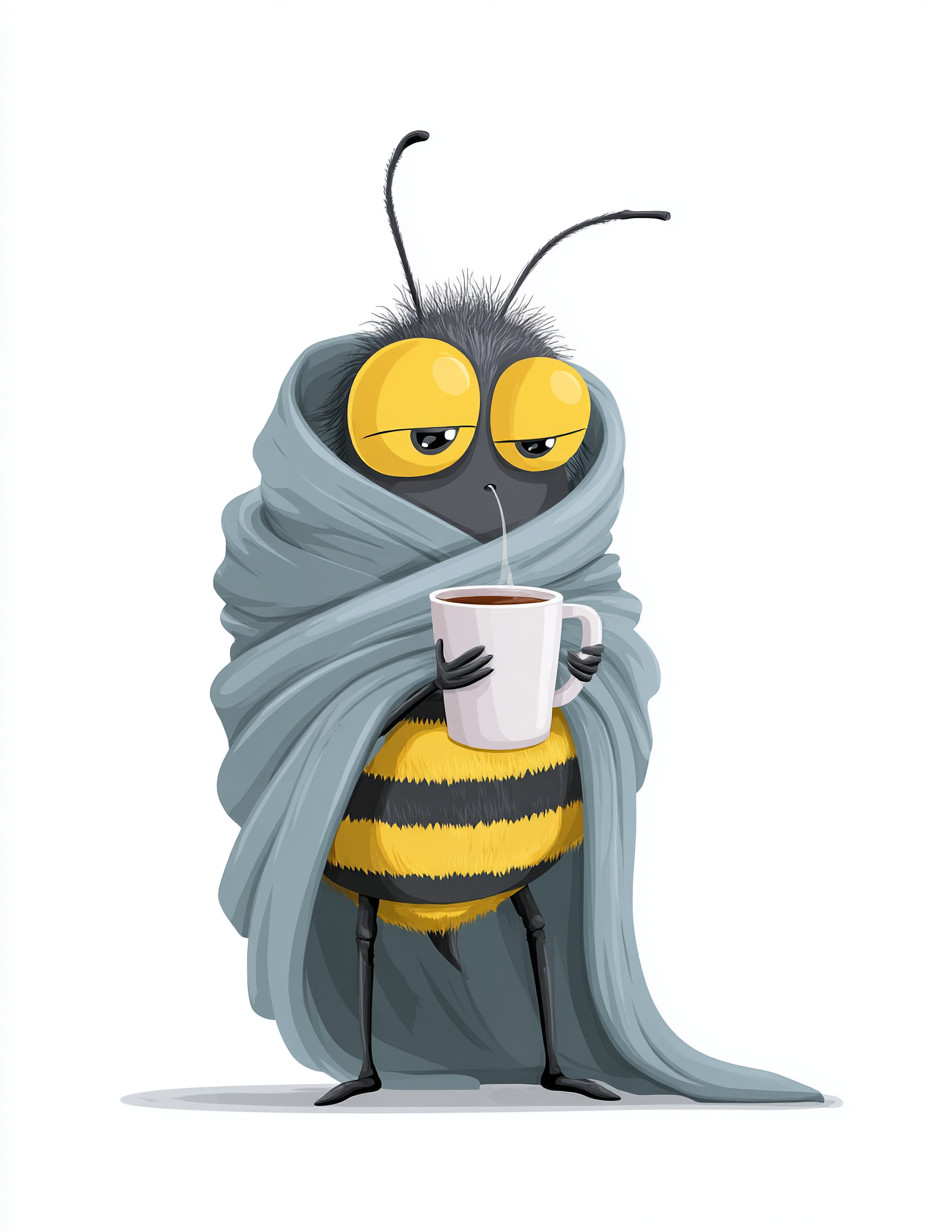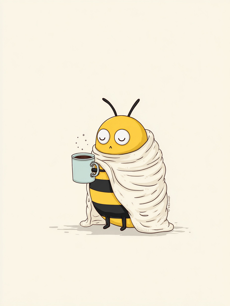 cartoon bee with a blanket wrapped around, sleepy eyes, sipping coffee, on a clean white minimalist background --ar 3:4 --v 7.0